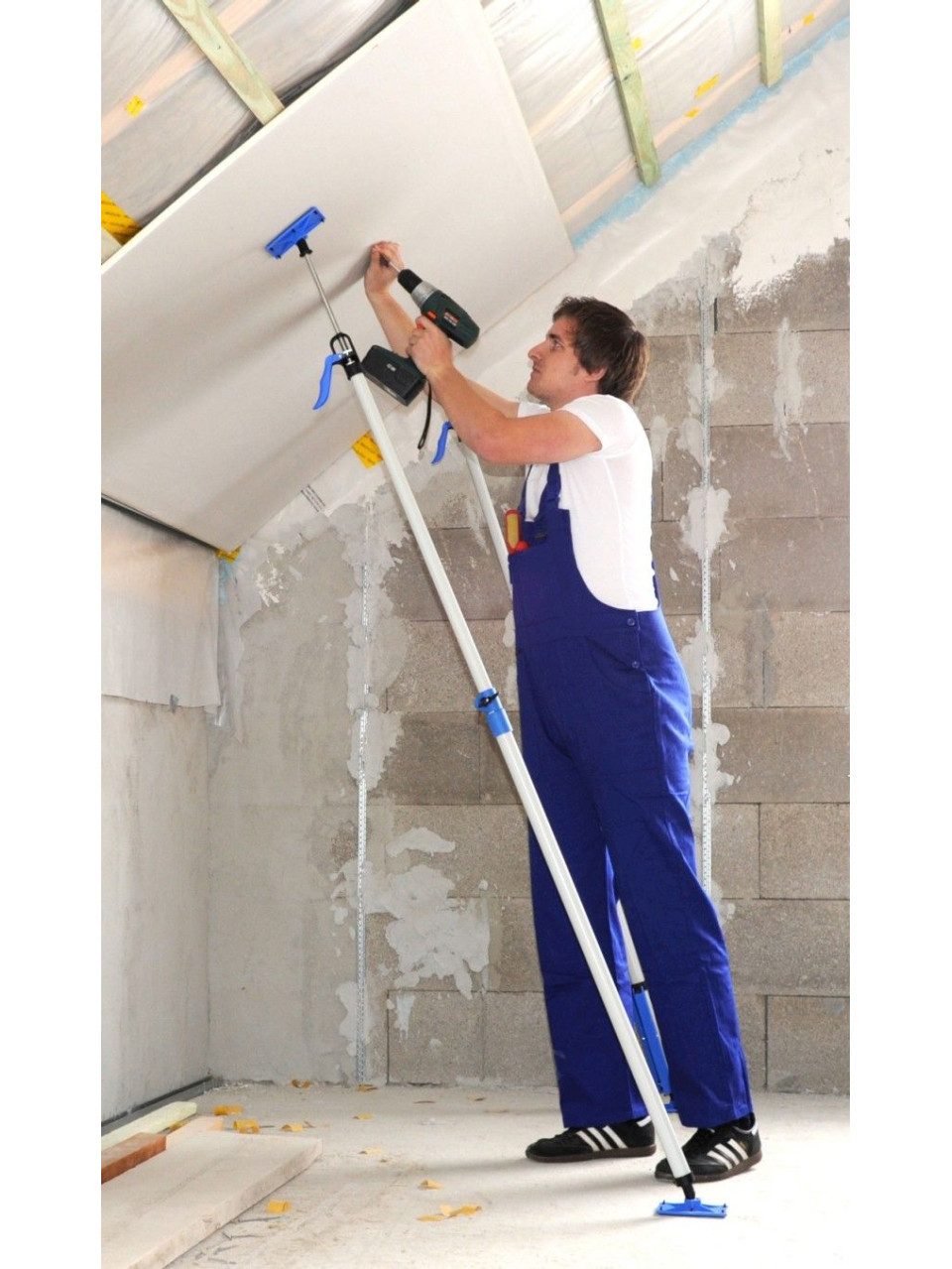 Die Profispann Deckenstütze ist der praktische Montagehelfer beim Trockenausbau. Die unterschiedlichsten Montagearbeiten an Decken oder Dachschrägen können mit Hilfe dieser praktischen Schnellspannstütze alleine erledigt werden. Die Profi Stütze ermöglicht das Abstützen, Positionieren und Fixieren von unterschiedlichsten Gegenständen, wie Gipskartonplatten, Holzbrettern, Holzdecken, Paneelen, Dachlatten, Metallleisten, Folien, Lampenkörpern, Gardinenleisten und vielem mehr. Die Profispann Deckenstütze verfügt über schwenkbare, in Kugel gelagerte Auflageplatten. Diese ermöglichen einen festen Halt der Stütze auch in Dachschrägen. Hiermit ist ein vielseitiger Einsatz an unterschiedlichsten Stellen gewährleistet. Die Profispann Stütze verfügt über ein Schnellspannsystem mit Pumpmechanismus und ermöglicht dadurch die Bedienung mit nur einer Hand. Die Grobeinstellung der Stütze erfolgt über eine große Flügelschraube. Die passgenaue Einstellung wird anschließend über den ergonomisch geformten Pumpgriff vorgenommen. Nach erfolgter Montage einfach den seitlichen Metallhebel betätigen um die Spannung zu lösen.
