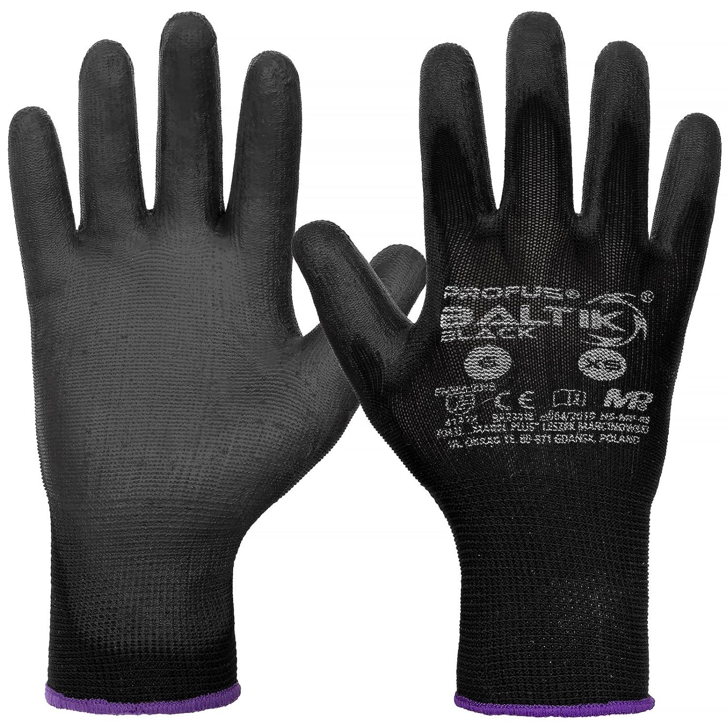 Die Arbeitshandschuhe erweisen sich als zuverlässiger Handschutz für alle Arten von Montagearbeiten in trockenen Bereichen. Durch die Anwendung eines dünnen, aber stabilen Gewirkes wird die Bewegungsfreiheit nicht eingeschränkt. Im Gegenzug sorgt sie für ein hohes Maß an Fingerfertigkeit und Fingerspitzengefühl, wodurch sich die Arbeitshandschuhe besonders für Tätigkeiten empfehlen, die ein hohes Maß an Genauigkeit erfordern. Die BALTIK BLACK Arbeitshandschuhe sind aus nahtlosem Nylonstrick hergestellt, daher sind sie gut ventiliert und eignen sich ideal für langfristige, manuelle Tätigkeiten. Handfläche und Finger sind mit einer dünnen Polyurethanschicht beschichtet, die die Oberhaut vor Verletzungen durch Schnitte oder Stiche schützt. Der breite elastische Bund verhindert, dass die Handschuhe von der Hand fallen. Anwendung Arbeitshandschuhe BALTIK BLACK sind für den Handschuhschutz bei allen Arten von Montagetätigkeiten in trockenen Bereichen bestimmt, insbesondere bei Hand- und Präzisionsarbeiten, die ein hohes Maß an Fingerspitzengefühl verlangen, sowie bei Tätigkeiten, bei denen Sauberkeit erforderlich ist. Produktmerkmale: - Kein DMF - CE-Kennzeichnung Kategorie II, gemäß EN 420 und EN 388 - mechanischer Schutz: Abriebfestigkeit (Stufe 4), Schnittfestigkeit (Stufe 1), Впередreißfestigkeit (Stufe 4), Durchstichfestigkeit (Stufe 1), TDM-Schnittfestigkeit (nicht anwendbar).