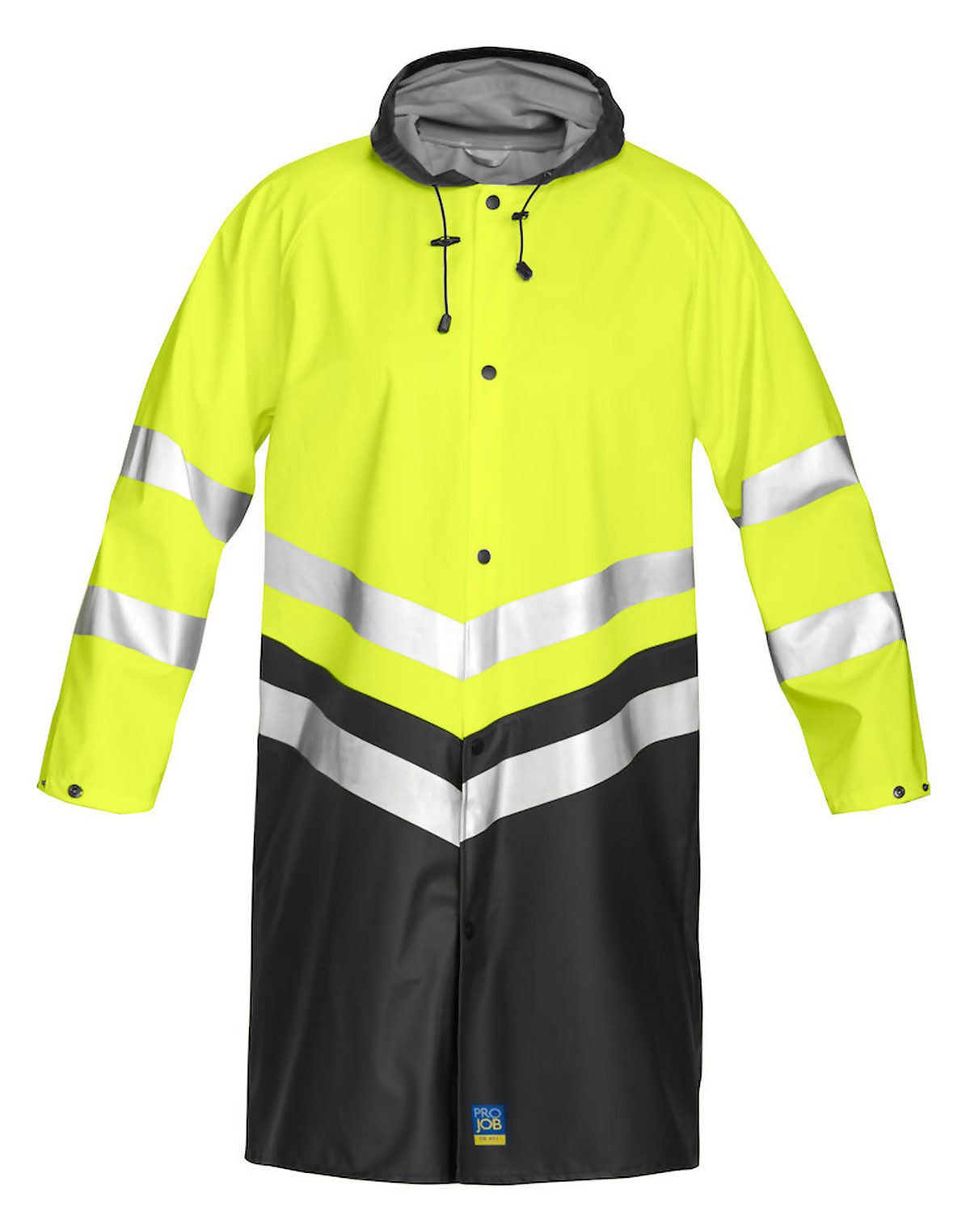 Lange Regenjacke, Длина 100 cm. Wind- und wasserdicht mit genähten und geschweißten Nähten. Verschluss vorne mit Druckknöpfen. Verstellbare Manschetten mit Druckknöpfen und verstellbare Kapuze mit Kordelzug. Polyurethan-beschichtetes Polyamid-Trikot, 170 g/m²
