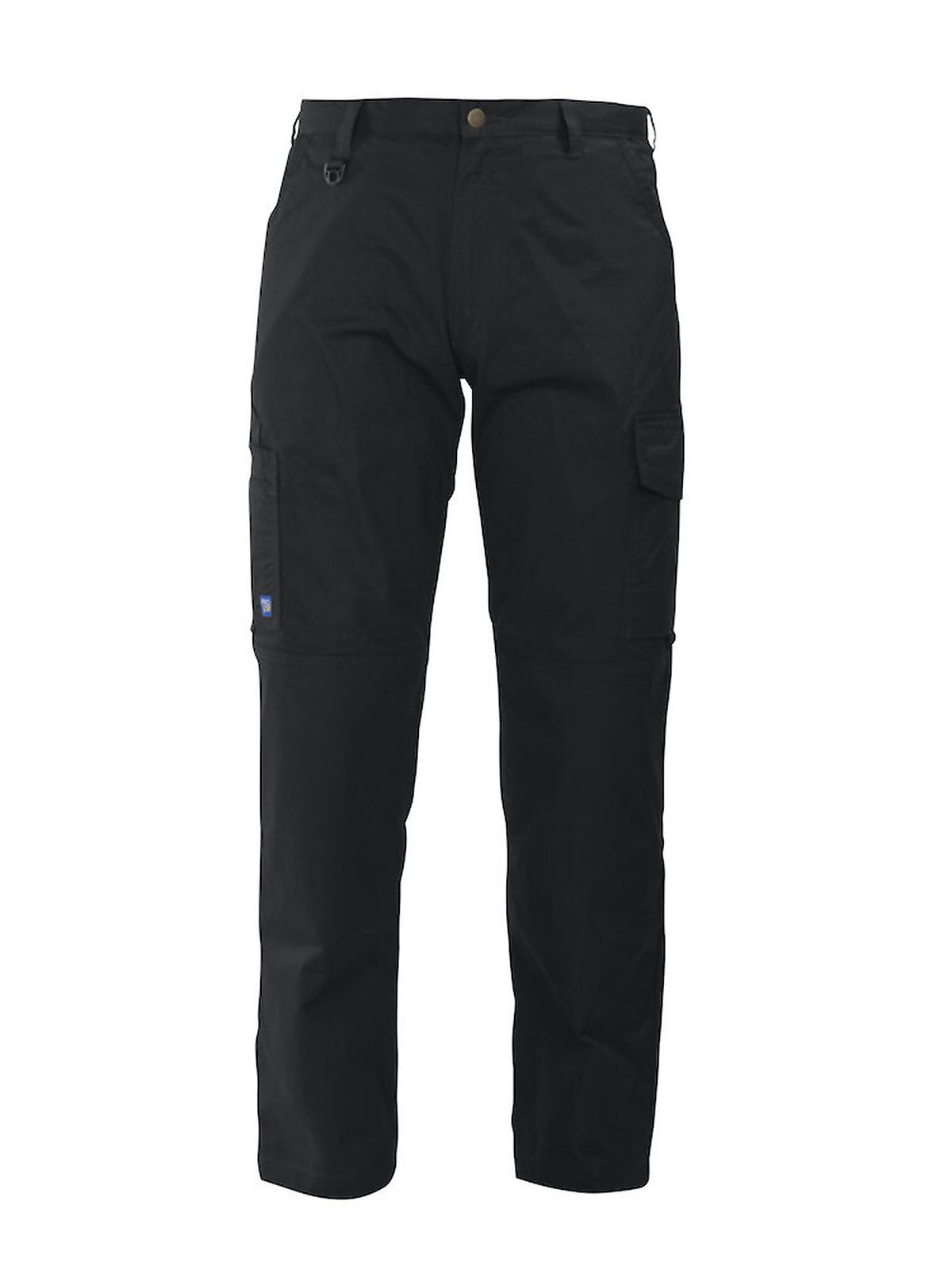 Arbeitshose ohne Bundfalten. Seitentaschen und Sicherheitstasche mit Reißverschluss auf der rechten Seite. Zwei aufgesetzte Gesäßtaschen. Zwei Beintaschen. Die linke Tasche mit Klappe und innen liegender Handy-Tasche. Die rechte Tasche bietet Platz für Mobiltelefon, Schreibgeräte, Dokumente und Zollstock. D-Ring für Schlüssel oder ID-Karte, etc.. Knieprotektortaschen mit Öffnungen auf der Innenseite des Hosenbeins. Schlaufen unter den Gesäß- und Beintaschen zur Befestigung von Inbags. 100% Baumwolle, 200 g/m²