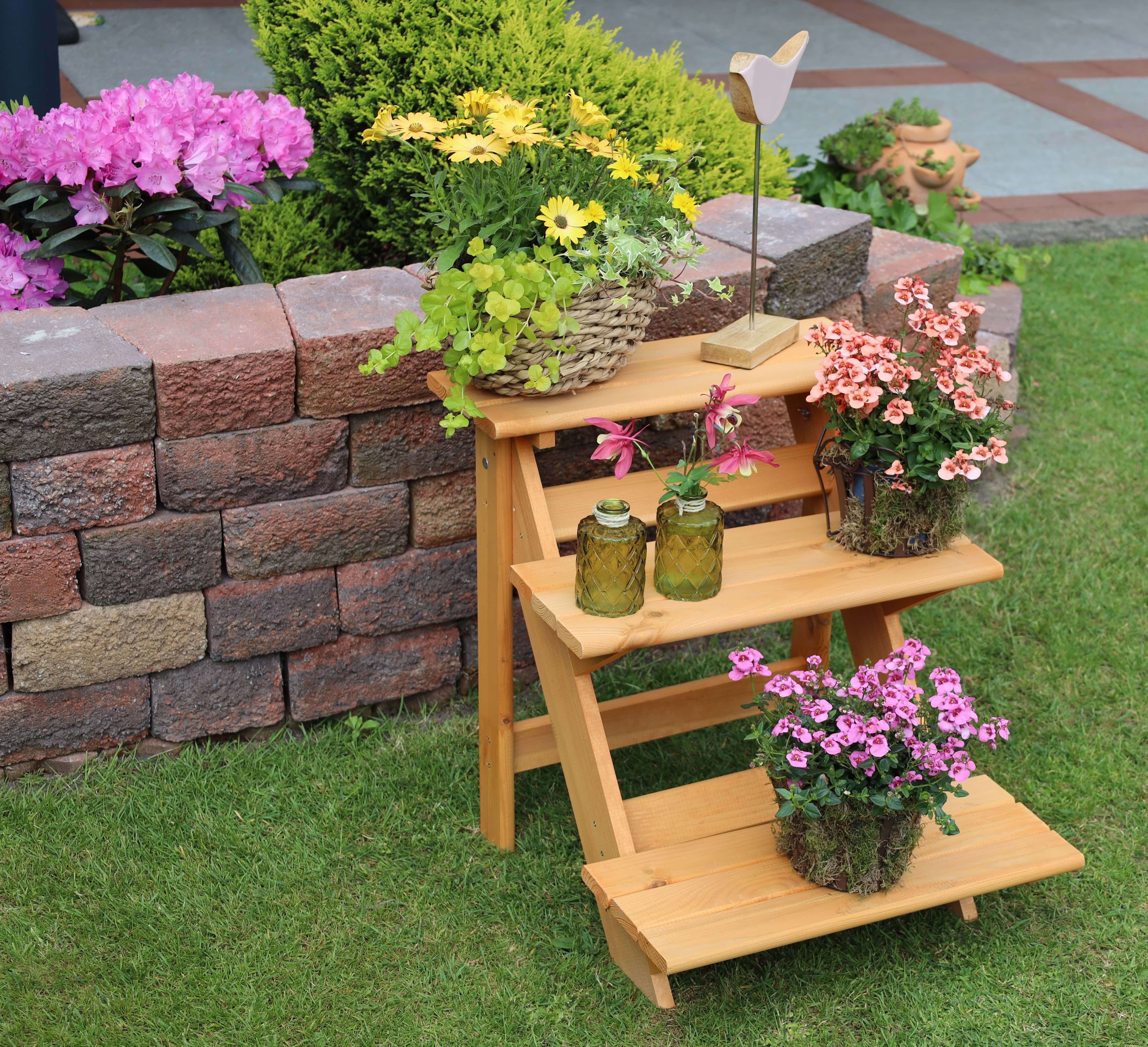 К сожалению, ist die Blumentreppe von minderer Qualität. Nachdem beim ersten Versuch einen Dübel einzuschlagen Holz abplatzte, haben wir alle Dübellöcher nachbohren müssen. Die bereits werkseitig eingesetzten 4 Dübel waren zu lang und mussten abgesägt werden. Die dreieckigen, an den Standfüssen angebrachten Auflagen für die Stufenbretter waren schlecht verleimt und z. T. aus mehreren Stücken zusammengesetzt. Positiv: die Ware kam früher als angekündigt.