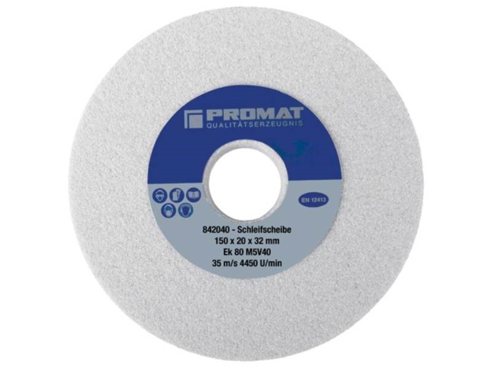 Schleifbockscheibe Ø300xB40x76mm 80 Form A m.Aussparung 125x19mm AlOxid PROMAT zum Einsatz auf Werkstatt-Schleifmaschinen · geeignet für Nass- und Trockenschliff · Edelkorund (Aluminiumoxid) weiß zur Bearbeitung von SS- und HSS-Stählen sowie für ungehärtete, gehärtete, legierte, nitrierte und rostfreie Stähle Впередe technische Eigenschaften: · Schleifmittel: Aluminiumoxid · Ausführung: mit Aussparung 125 x 19mm · Form: A 4000 842 056 mit Aussparung 125 x 19 mm