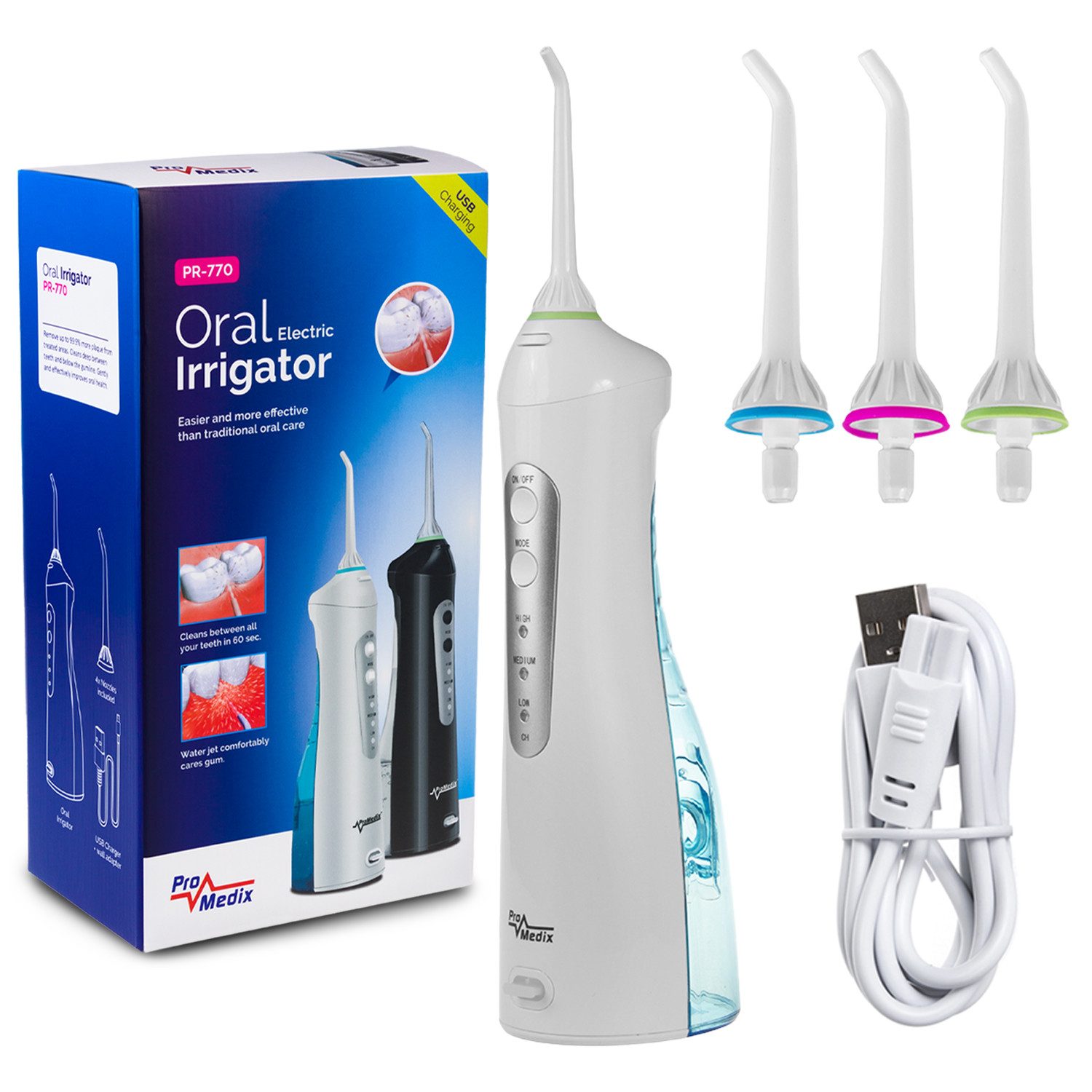 Der PR-770 ist ein moderner kabelloser Irrigator, dessen starker Wasserstrahl Speisereste aus den Interdentalräumen entfernt und die Mundhygiene aufrechterhält. Ein starker Strahl mit einer Kraft von bis zu 8,5 Bar beseitigt das Problem der Unterreinigung von orthodontischen Geräten, Brücken oder Implantaten. Durch die Bewässerung können Zahnfleischblutungen und die Menge an Bakterien, die Entzündungen verursachen können, erheblich reduziert werden.
