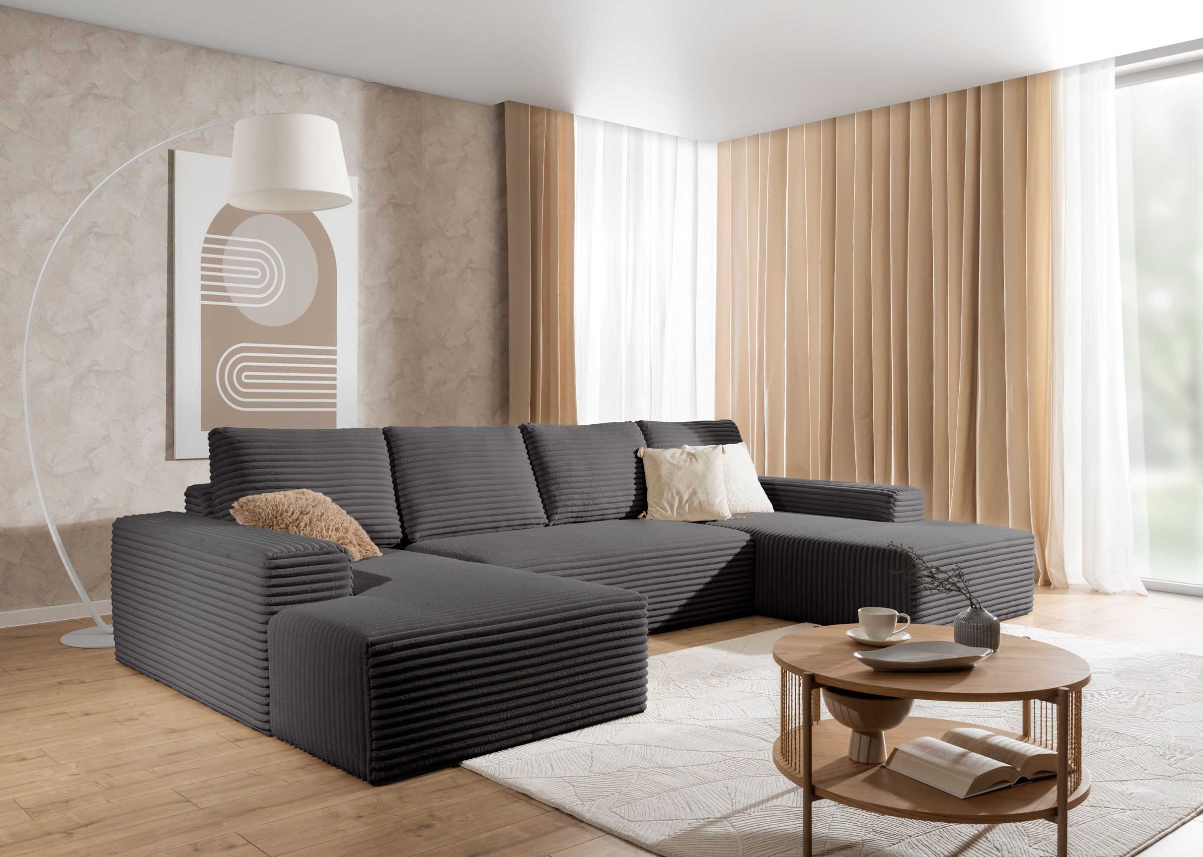 Das moderne Ecksofa Azzano in U-Form ist die ideale Ergänzung für Ihr Wohnzimmer, entworfen mit stilvollem, minimalistischem Design. Mit seiner großzügigen U-Form bietet das Sofa reichlich Platz, optimal für das Zusammentreffen mit Familie und Freunden. Die breite und weiche Sitzfläche sowie die komfortablen Kissen, gefüllt mit Silikonkugeln, garantieren höchsten Sitzkomfort. Hergestellt aus pflegeleichtem Breitcordstoff, fügt es sich nahtlos in die moderne Wohnlandschaft ein und verbindet praktische Pflege mit ansprechender Ästhetik.