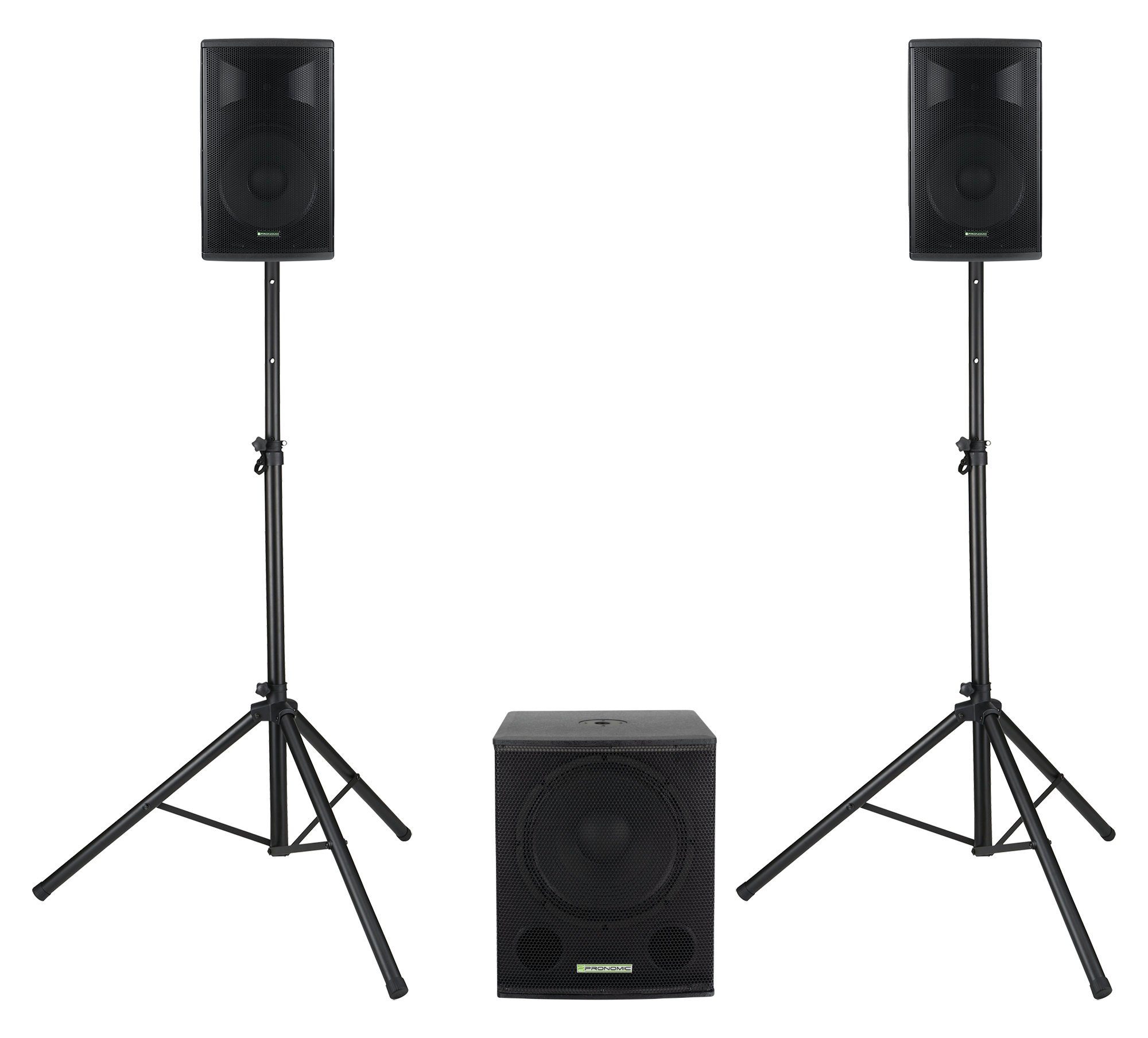 Das Live-Set von Pronomic besteht aus einem Subwoofer und 2 Hochtönern, welche auch alleine als mobile Fullrange-Lautsprecher genutzt werden können. Zusammen mit den Stativen lässt sich damit richtig einheizen.