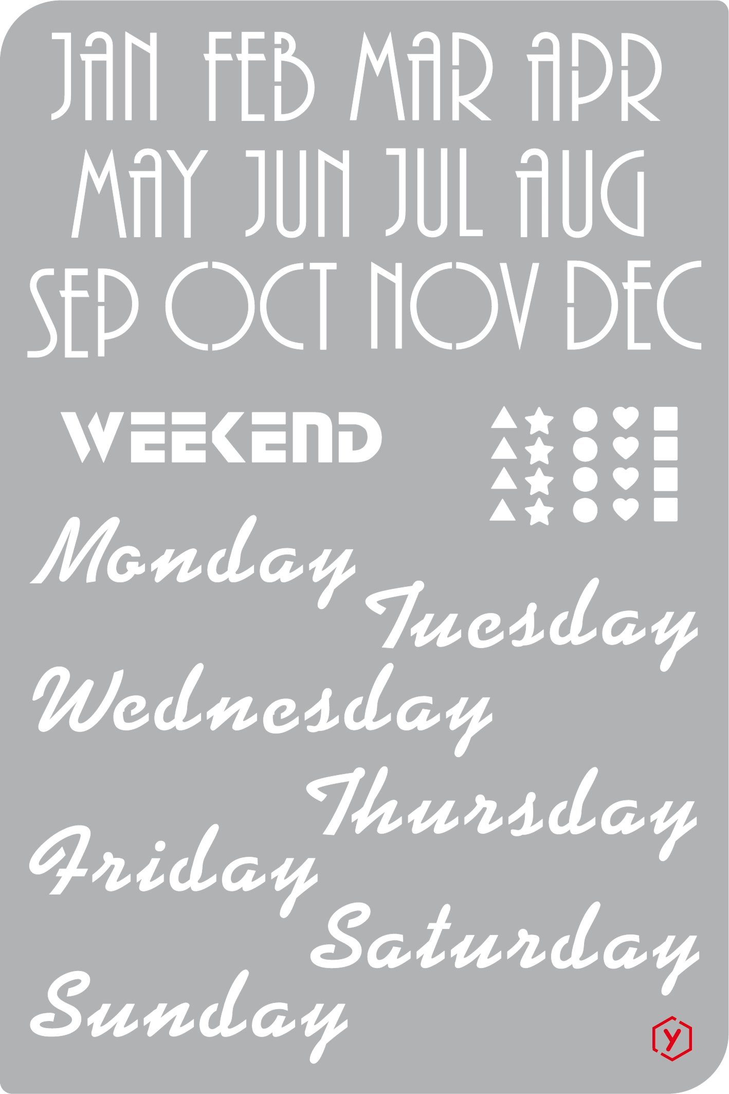 Die praktische Bullet Journal Schablone 'Kalender' hat eine Motivgröße von 0,5 cm bis 7,5 cm. Die 25 Motive sind zum Beispiel die Abkürzung JAN für Januar, die Wochentage in Englisch, Weekend und einige kleine Zeichen. So bekommen die Texte in Ihrem Planer immer ein gleichmäßiges Aussehen.
