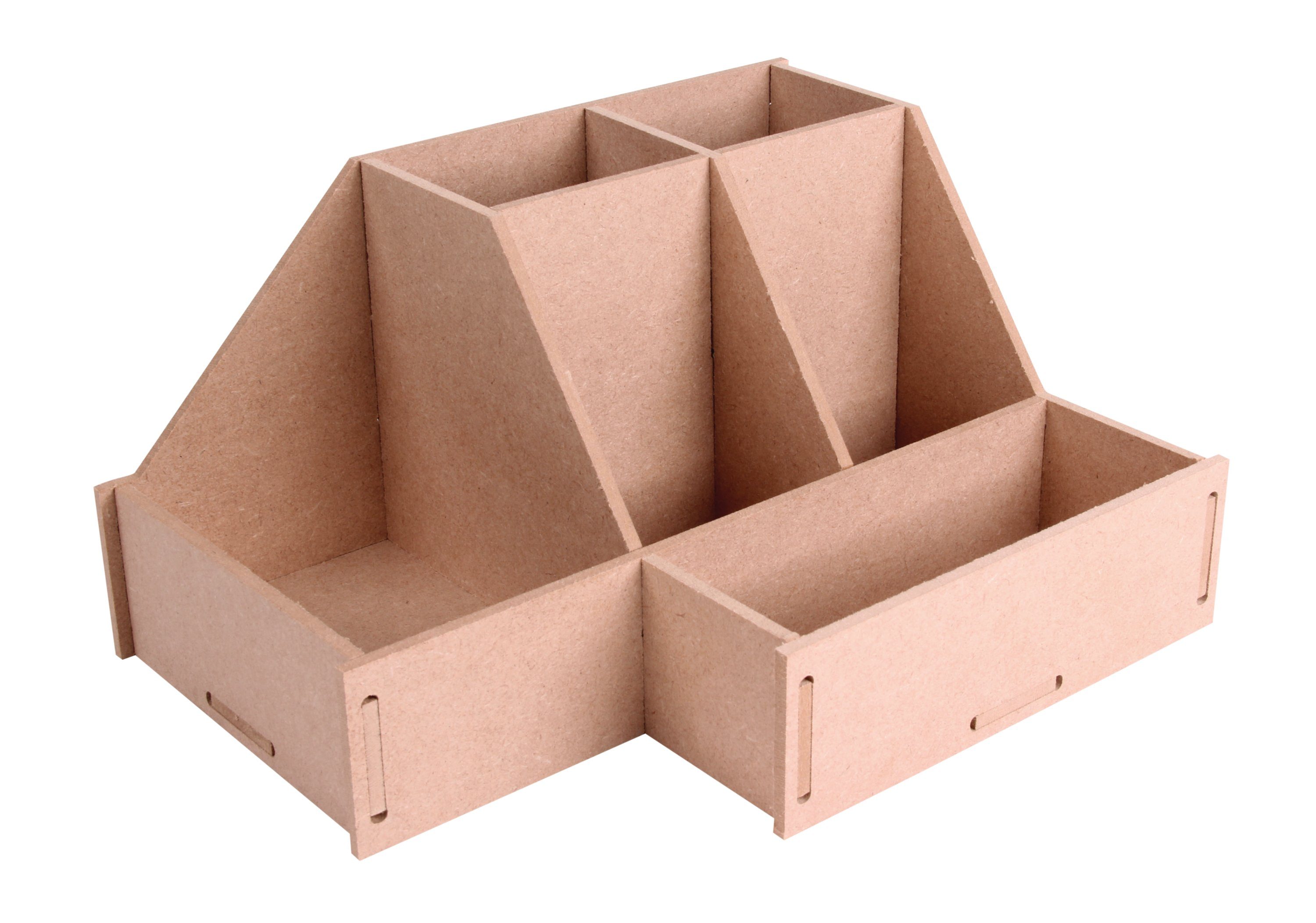 Du möchtest endlich Ordnung auf deinem Schreibtisch schaffen? Dann ist der Flexio 'Organizer - Toolbox' genau das Richtige für dich! Mit der box aus dem Bausatz aus 9 Teilen kannst du ganz einfach Stifte, Scheren, Zettel und vieles mehr aufbewahren. Die unterschiedlichen Größen und Boxen sind kombinierbar und lassen sich zu einem individuellen Regal zusammenstellen. Für eine stabile Fixierung empfehlen wir Bastelkleber (nicht enthalten). Mit einer Размер von 24 x 18 x 12,3 cm bietet der Tischorganizer genügend Platz für deine Arbeitsutensilien. Das Material aus 4.0 mm MDF-Holz ist stabil und eignet sich perfekt zum Gestalten mit verschiedenen Farben, Pasten, Papieren und Materialien. Mache deinen Schreibtisch zum Hingucker und werde mit dem Flexio 'Organizer - Toolbox' zum Organisationsprofi!