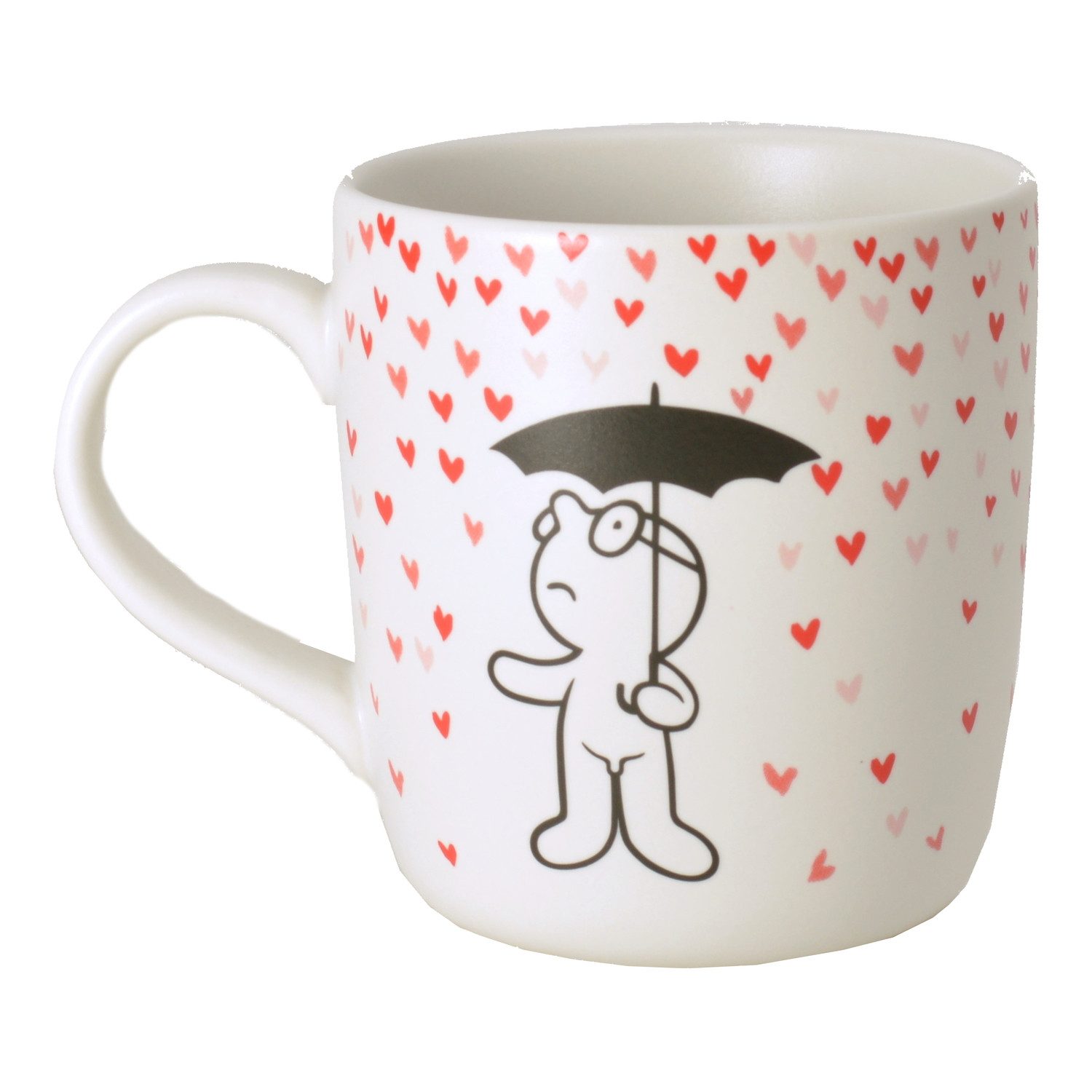 Etwas urkomisches, wie die Mr. P Heart Kaffeetasse, zu schenken bereitet nicht nur dem Empfänger des Geschenkes eine Mordsfreude, sondern gibt dem edlen Schenker auch ein super tolles Gefühl. Fällt einem so gar nicht ein was man verschenken könnte, ist ein lustiger Kaffeebecher eine sehr gute Geschenkidee. Man kann ihn immer gebrauchen und er sagt einiges über seinen Besitzer aus. Natürlich kann man aus einem Kaffeebecher nicht nur Kaffee genießen. Ideal für Kaffee, schwarzer Tee oder Glühwein. Aus dem eigenen Kaffeebecher ist der Genuß dann noch am höchsten. Der Kaffeebecher ist in den Farben weiß und rot gestaltet. Auf der Vorderseite steht Mr. P mit einem Regenschirm in der Hand. Er schützt sich vor Regen, der aus unzähligen kleinen Herzen besteht. Die Herzen befinden sich auf dem gesamten Mr. P Kaffeebecher. Die bedruckte Tasse besteht aus Keramik und hat eine matte Oberfläche mit einer besonders angenehmen Haptik. Der Mr. P Heart Kaffeebecher misst ca. 8,5 cm im Durchmesser und ca. 9,5 cm in der Höhe. sie besitzt ein Fassungsvermögen von ca. 300 ml. Der Mr. P Heart Kaffeebecher ist perfekt für junge Frauen geeignet. Nach der Pubertät befinden sich junge Frauen in einem neuen Lebensabschnitt. Junge Frauen gehen gerne shoppen und interessieren sich stark für Mode. Sportliche Hobbies, wie Tanzen oder Turnen gehören in den Alltag von jungen Frauen. Ein starkes Band besteht vor allem zwischen jungen Frauen und Tieren, deshalb widmen sie Tieren viel Zeit. Für junge Frauen hat die Liebe einen hohen Stellenwert und somit auch der erste Kuss und der erste Freund.