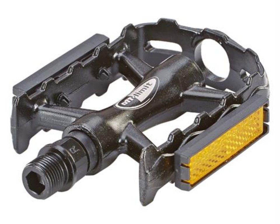 Prophete Mountainbike Pedale mit nochwertigen Industrielager aus Aluminium  mit Reflektoren nach StVZO zugelassen Lieferumfang: 2 Pedale davon 1x linkes und 1x rechtes Pedal Farbe: schwarz Maße : 7,5 x 10 x 2,3 cm ( BxLxH ) Duchmesser Gewinde: 1,4 cm