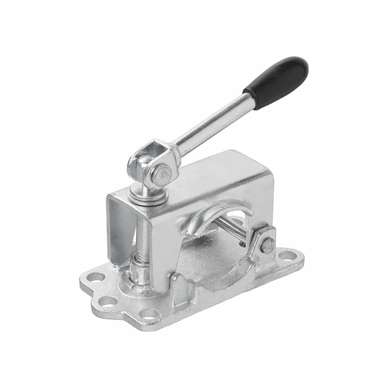 Eine Guss- Klemmhalterung / Klemmschelle mit einer M12 Klappknebel für Stützräder und Schiebstützen hat einen Durchmesser von Ø 48 mm. Der Lochabstand beträgt 105 mm - 2 Bohrungen 10,5 mm. Die Klemmhalterung / Klemmschelle ist aus verzinktem Stahl.