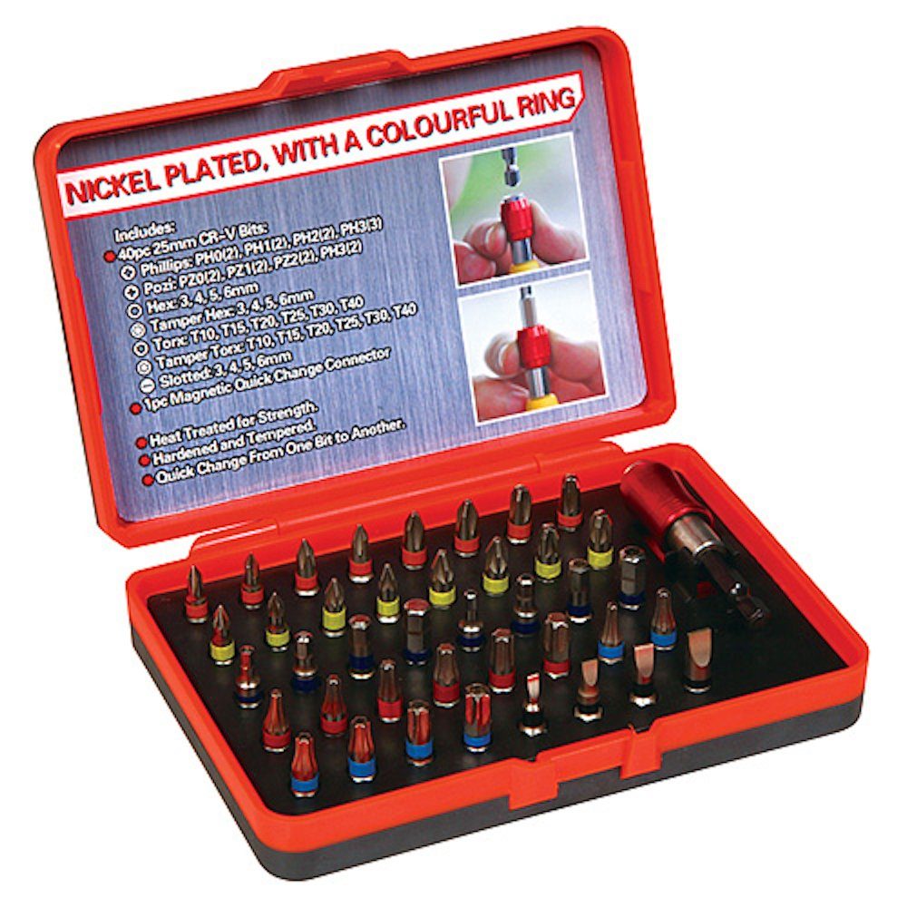 40x Bit 25mm: pH: 0,0,1,1,2,2,3,3 PZ: 0,0,1,1,2,2,3,3 h: 3,4, 5,5 h mit einem Loch: 3,4,5, 6 T: 10,15,20,25,30,40 T mit Loch: 10,15,20,25,30,40 SL: 3,4,5,6 1x Mag. Bitadapter