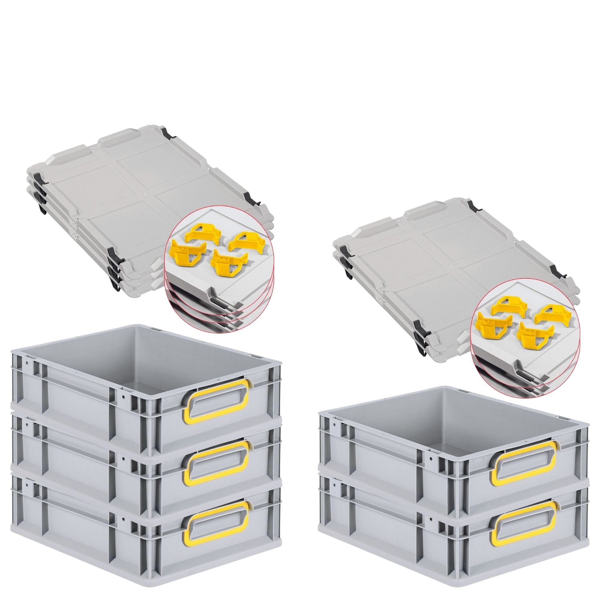 Großzügige und ergonomische Griffmulden (offen oder geschlossen) für den einfachen Transport sowie extra verstärkter Boden bei großen Euroboxen