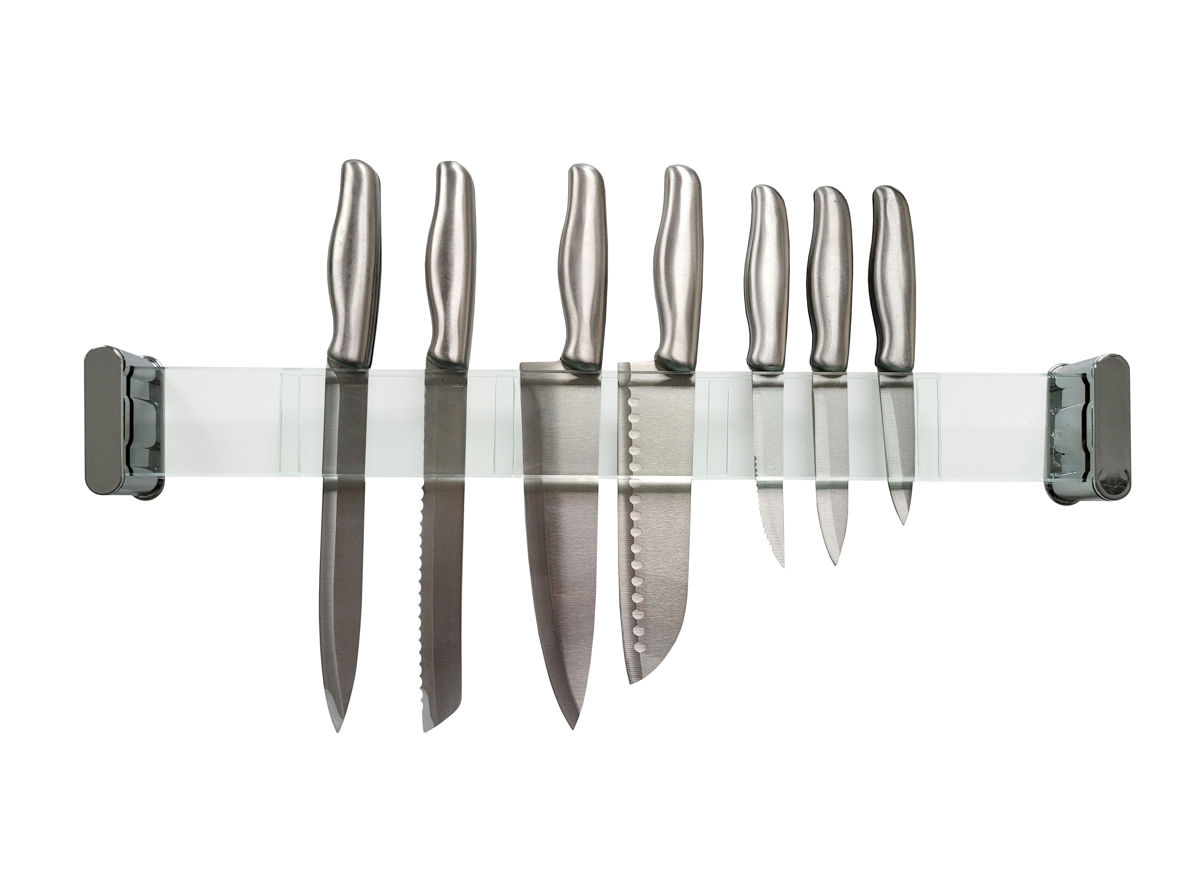 Hinweis: Die abgebildeten Messer sind NICHT Bestandteil dieses Angebots. Sie erhalten die Messerleiste aus Glas und das Montagezubehör.