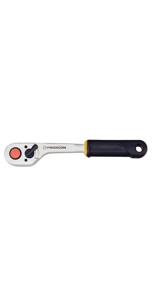 Mit makelloser Verzahnung: Mehrere der 72 Zähne rasten gleichzeitig ein und übertragen ein extremes Drehmoment. Umschalthebel für Rechts- und Linkslauf. Entriegelungs-Mechanismus: Lösen der Einsätze durch Knopfdruck. Kopf und Schaft aus einem Stück CrV-Stahl geschmiedet, 2x vernickelt und matt-verchromt. Griff aus öl- und säurefestem TPR (Thermoplastic Rubber) mit praktischer Bohrung zum Aufhängen