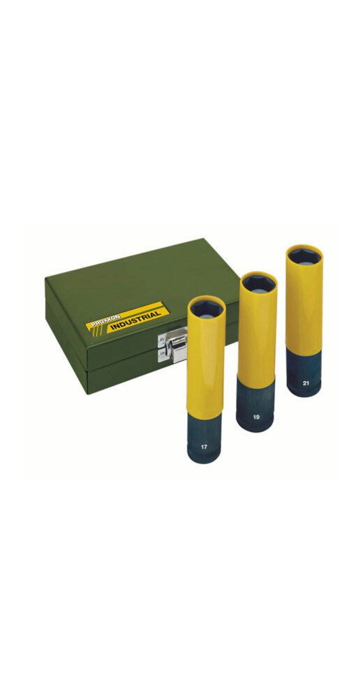 Einsätze mit Kunststoffhülle und eingesetztem Kunststoffteil als Anschlag. Zum Einsatz mit Druckluftschraubern 1/2. Hochlegierter Spezialstahl für extreme Verschleißfestigkeit und maximales Drehmoment von 500 Nm. ein Stück 17 - 19 und 21 mm in stabiler Stahlbox (pulverbeschichtet).
