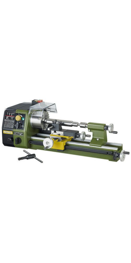 Spindelstock: Aus Alu-Druckguss. Präzisionsgelagerte Hauptspindel (Rundlaufgenauigkeit ohne Futter 1/100 mm) mit 10,5 mm Durchlass. Futterseitig 70 mm auf 14 mm hohlgebohrt. Mit MK 2-Aufnahme. Drehschalter für die Zuschaltung des automatischen Vorschubs über Leit- und Zugspindel (wahlweise 0,05 oder 0,1 mm/U).
