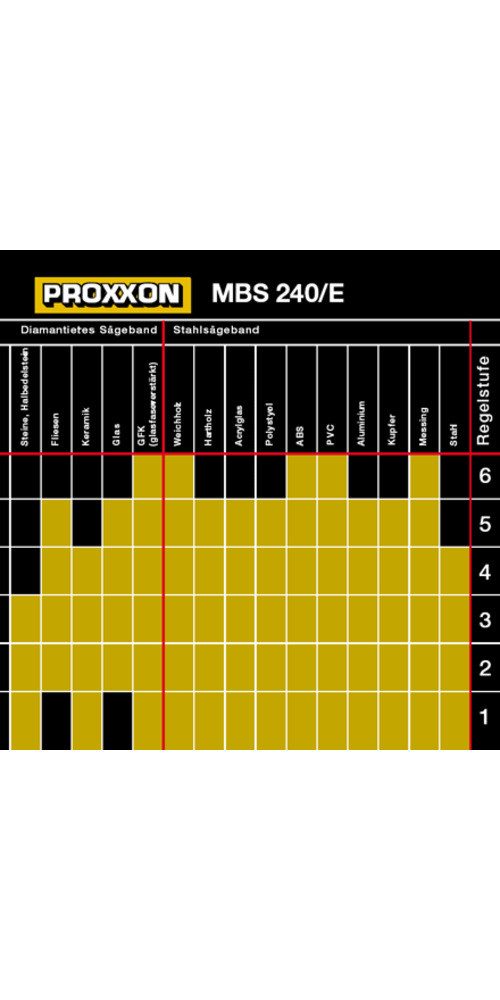 Eine übersichtliche Tabelle nennt den Regelbereich für praktisch alle Werkstück-Materialien. Die für feine Arbeiten ideale Bandstärke (5 x 0,4 mm) ermöglicht Kurvenschnitte mit engen Radien. (Siehe Bild)