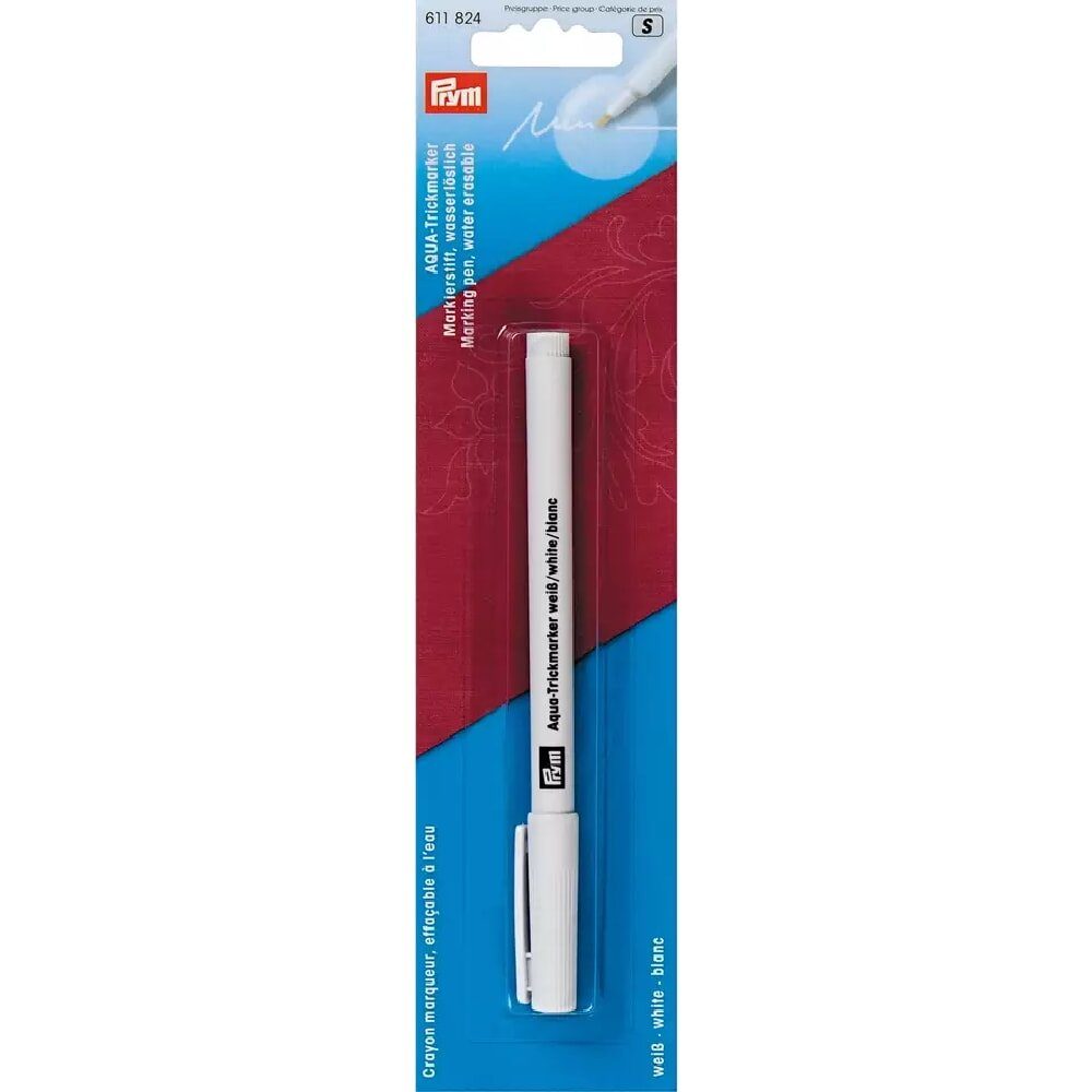 Der weißfarbene wasserlösliche Markierstift von Prym ist besonders gut geeignet für das Anzeichnen von Markierungen, die nach dem Patchworken, Quilten, Nähen oder Sticken nicht zu sehen sein sollen. Der Trickmarker soll senkrecht mit der Kappe nach unten gelagert werden, um ihn vor dem Austrocknen zu bewahren. Die Markierungen können durch Betupfen mit einem feuchten Tuch wieder vom Stoff entfernt werden. Für dunkle Stoffe bestens geeignet. Achtung: Testen Sie die Markier- und Entfernungseigenschaften vorab an einem Musterstoff.
