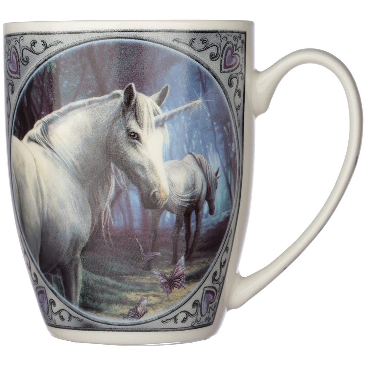 Umgeben von einer malerischen Waldlandschaft, tummeln sich grazile Einhörner auf dieser exquisiten Tasse, begleitet von zierlichen Schmetterlingen auf dem Henkel
