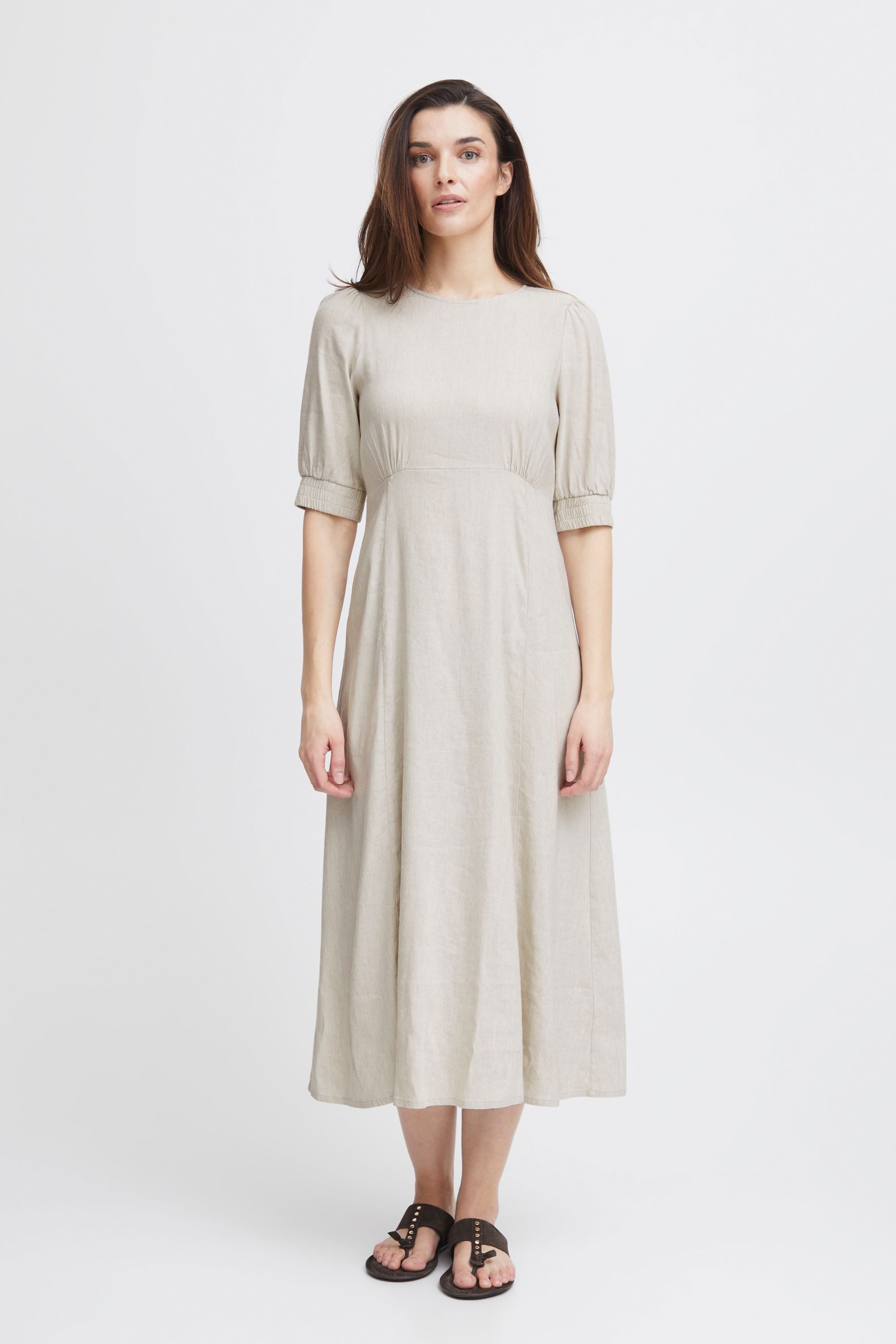 Midi-Kleid mit fließender A-Linie, rundem Ausschnitt und halblangen, leicht gerafften Ärmeln. Lockere Passform mit sichtbarer Teilungsnaht unter der Brust.