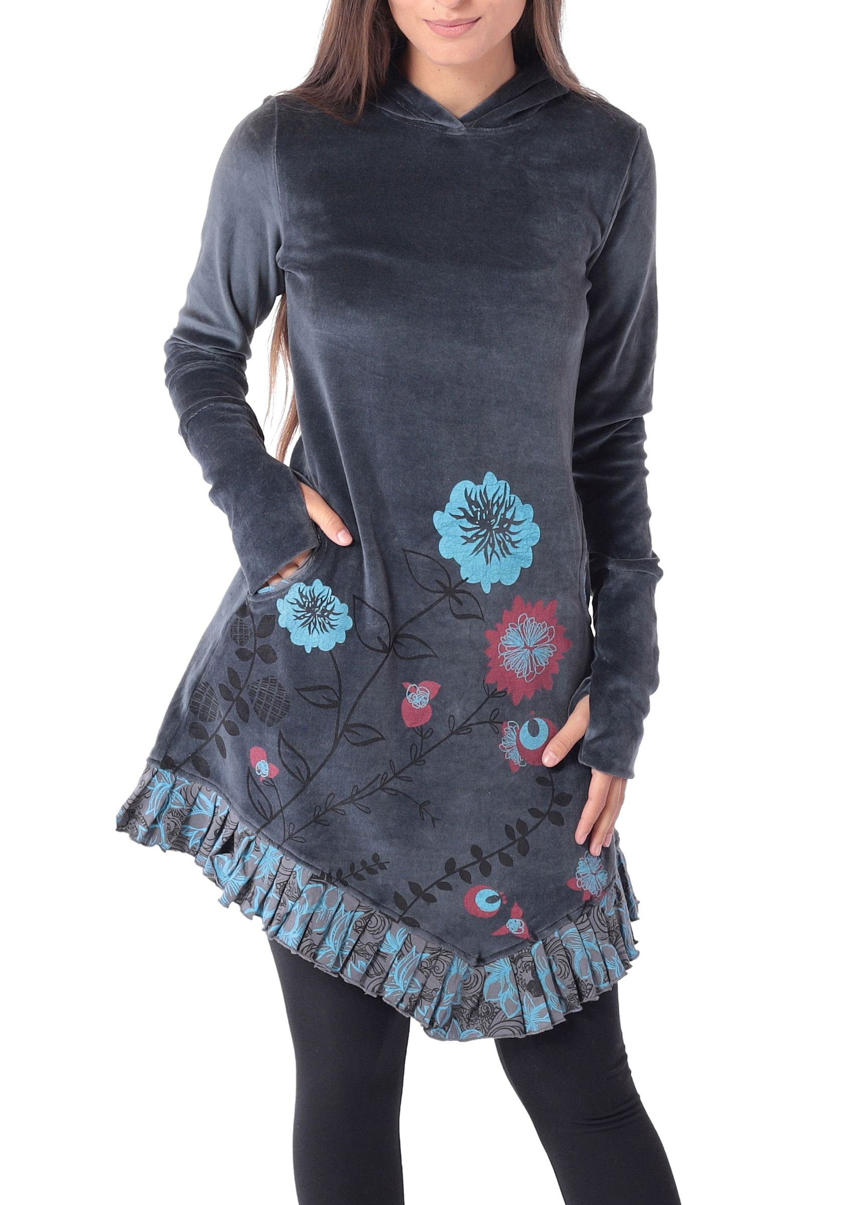 Das hübsche Elfenkleid aus Samt mit Zipfelkapuze und zwei Seitentaschen eignet sich perfekt für die Übergangszeit und für kühlere Tage. Besonders schön ist der Druck mit den Blumen und der asymmetrisch geschnittene Rüschensaum. Die Ärmelenden haben Daumenlöcher.