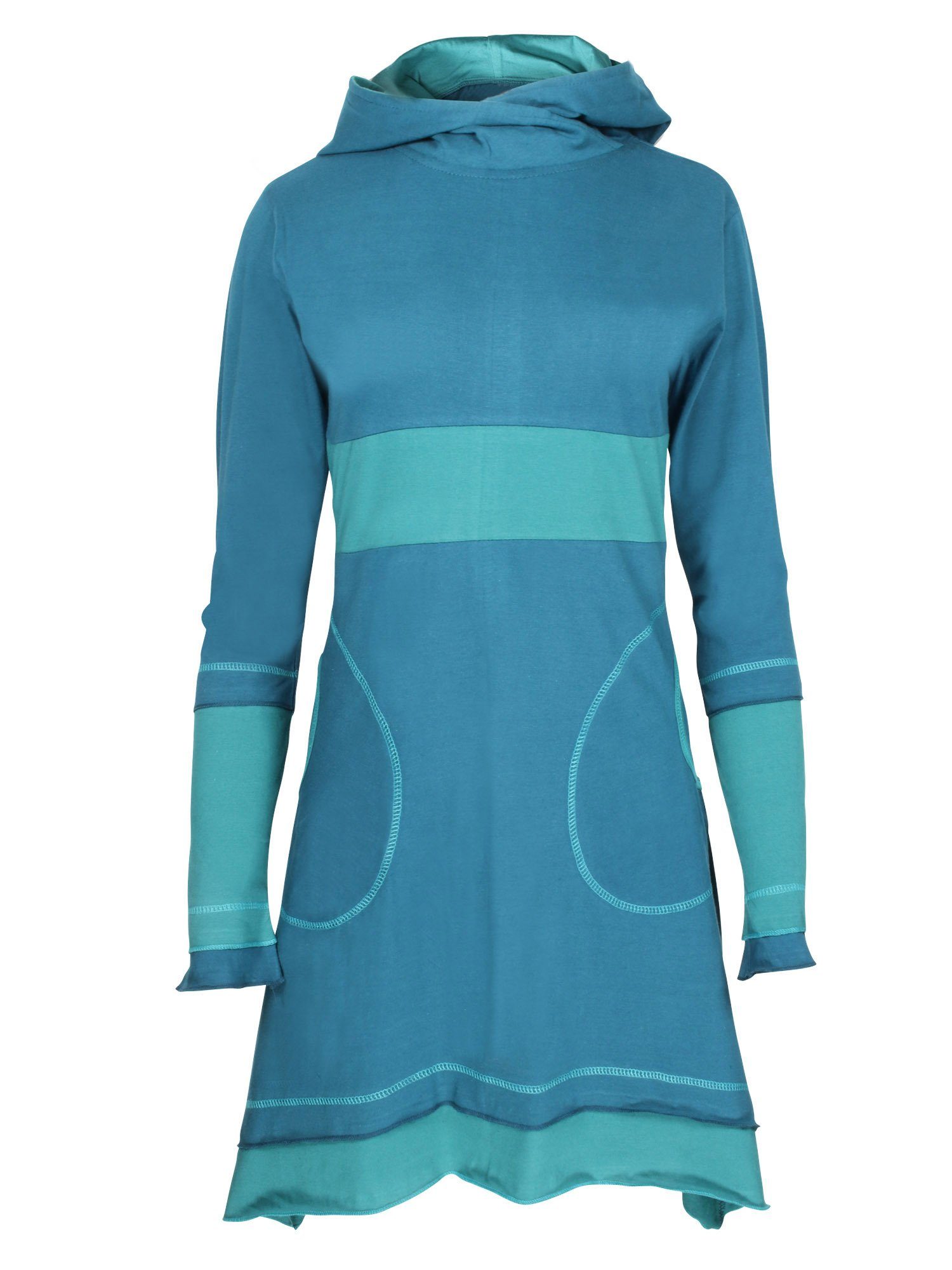 Das langärmlige Kapuzenkleid mit Taschen ist bei jedem Anlass ein Blickfang. Hergestellt wurde es in Handarbeit in einer kleinen Firma in Nepal. Das Ganzjahreskleid hat angesetzte Armstulpen mit Daumenlöchern und eine Zipfelkapuze.
