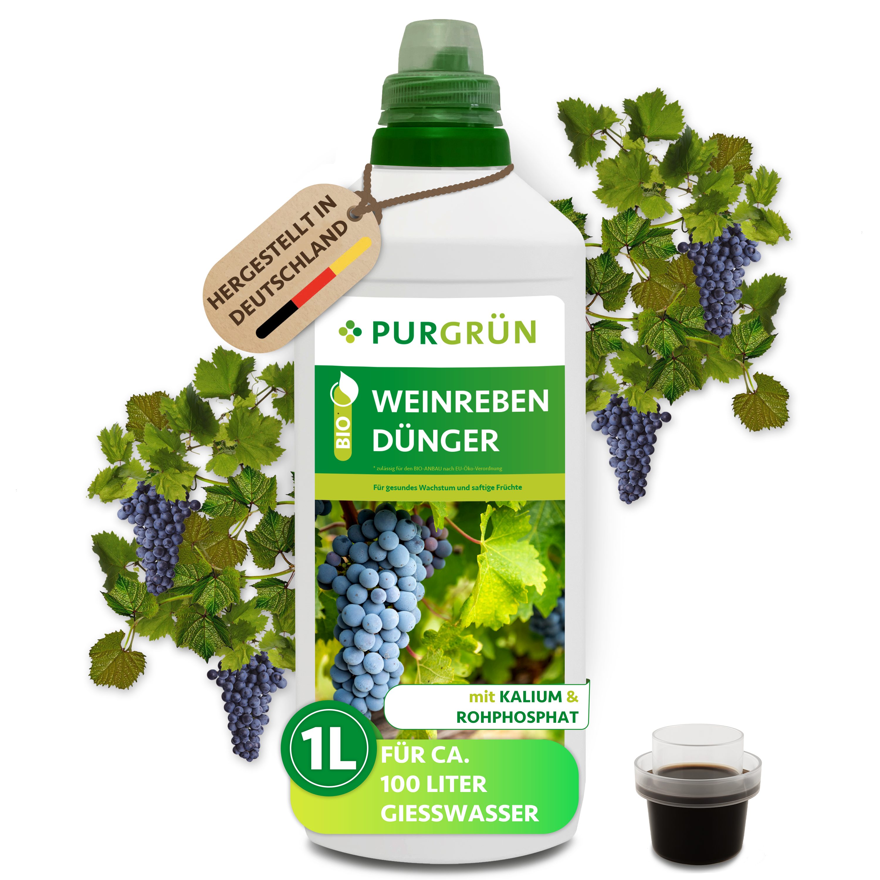 Dank der hohen Ergiebigkeit reicht eine 1-Liter-Flasche Purgrün Bio-Weinreben-Dünger für ca. 100 Liter Gießwasser.