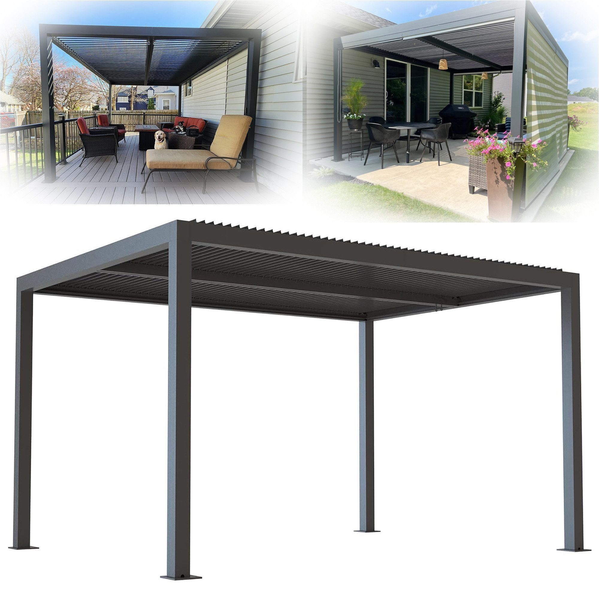 Diese moderne Aluminium Pergola von PURPLE LEAF ist die perfekte Überdachung für Terrasse, Garten oder Poolbereich. Die verstellbaren Lamellen bieten flexiblen Sonnenschutz, Regenschutz und Windschutz – ideal als wetterfeste Terrassenüberdachung, eleganter Grillpavillon oder robuster Carport Aluminium. Dank der hochwertigen pulverbeschichteten Aluminiumkonstruktion ist die Pergola besonders wetterfest, winterfest und pflegeleicht – perfekt für ganzjährige Nutzung. Die stilvolle Optik in Grau passt sich jeder Sitzlounge outdoor wetterfest, jedem Gartenmöbel-Set und jedem modernen Terrassendesign an. Auch als Sichtschutz Balkon freistehend oder als Design-Highlight auf Ihrer Terrasse macht diese Pergola eine großartige Figur.