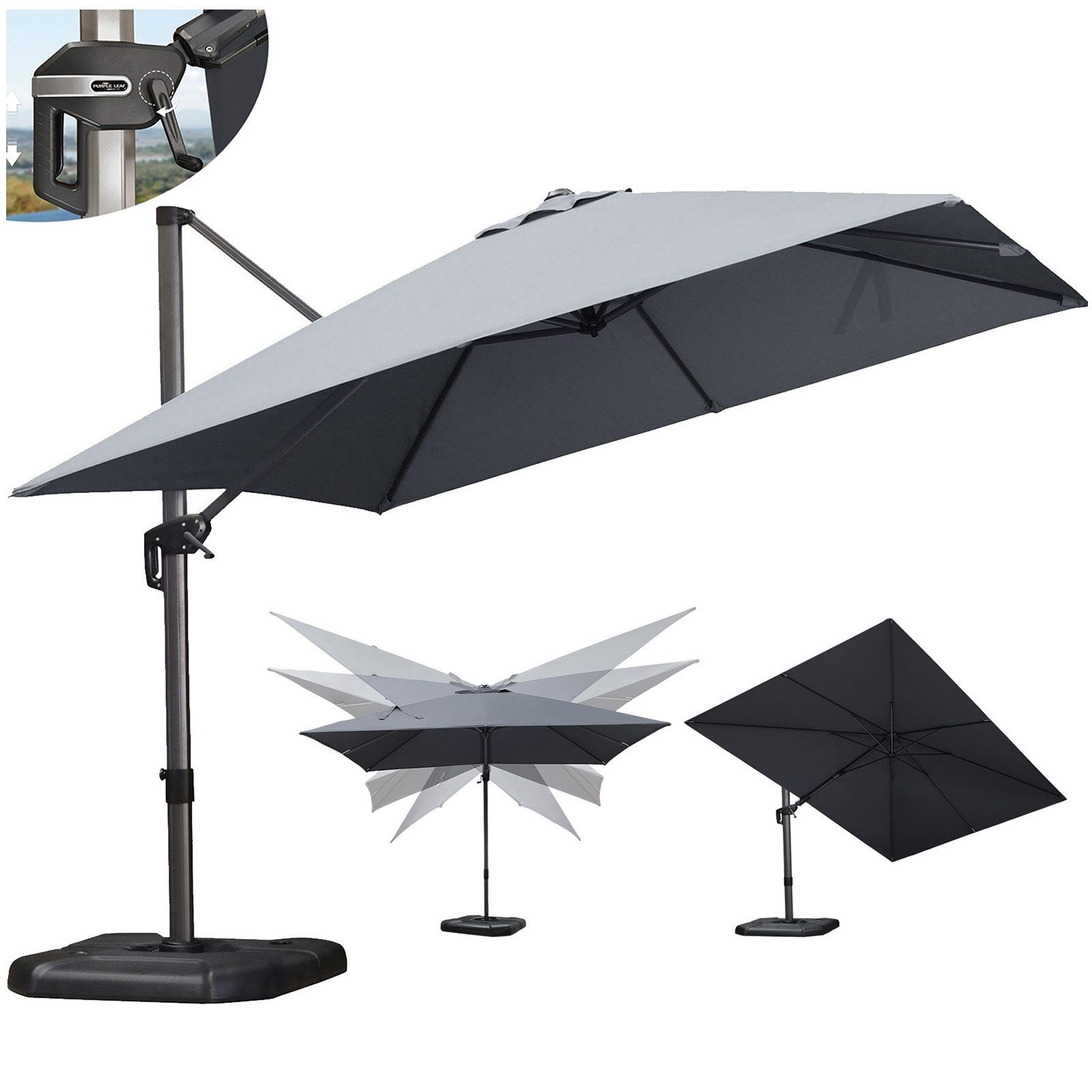 Lassen Sie diesen einzigartigen PURPLE LEAF Sonnenschirm Ihre schönen Sommertage begleiten! Ob im Garten, am Strand oder auf dem Balkon, das stilvolle Design des Schirmdachs und die einzigartige rotierende Schirmfläche bieten Ihnen perfekten Sonnenschutz. Passen Sie den Schatten je nach Bewegung der Sonne an und genießen Sie stets angenehme Kühle.