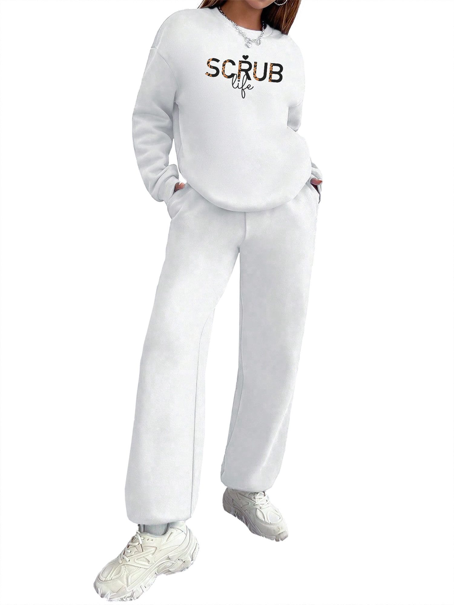 Dieses Damen-Winteroutfit aus dickem, bequemem Stoff besteht aus einem Fleecepullover mit Rundhalsausschnitt und einer hoch taillierten Jogginghose.