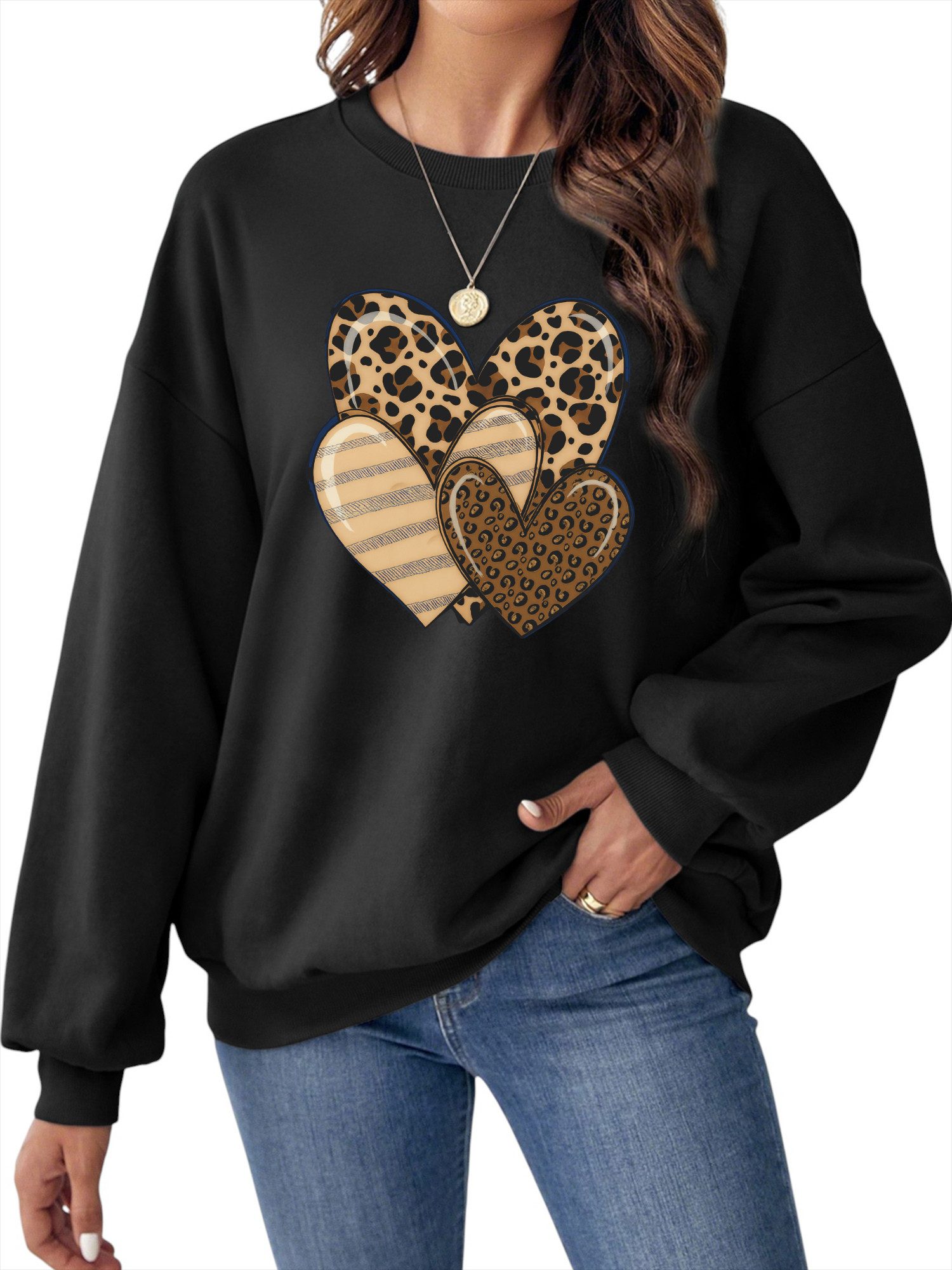 Entdecke unser Damen-Sweatshirt mit Herz mit Leopardenmuster Print! Aus weicher Baumwoll-Mischung und mit kuscheligem Flauschfutter innen ist dieses Oversized-Teil superbequem, leicht und wärmend. Der lässige Boyfriend-Schnitt mit Drop-Schultern und langen Raglan-Ärmeln garantiert ultimativen Comfort. Perfekt für Uni, Office, Training oder Freizeit – stylischer Allrounder für innen & außen!