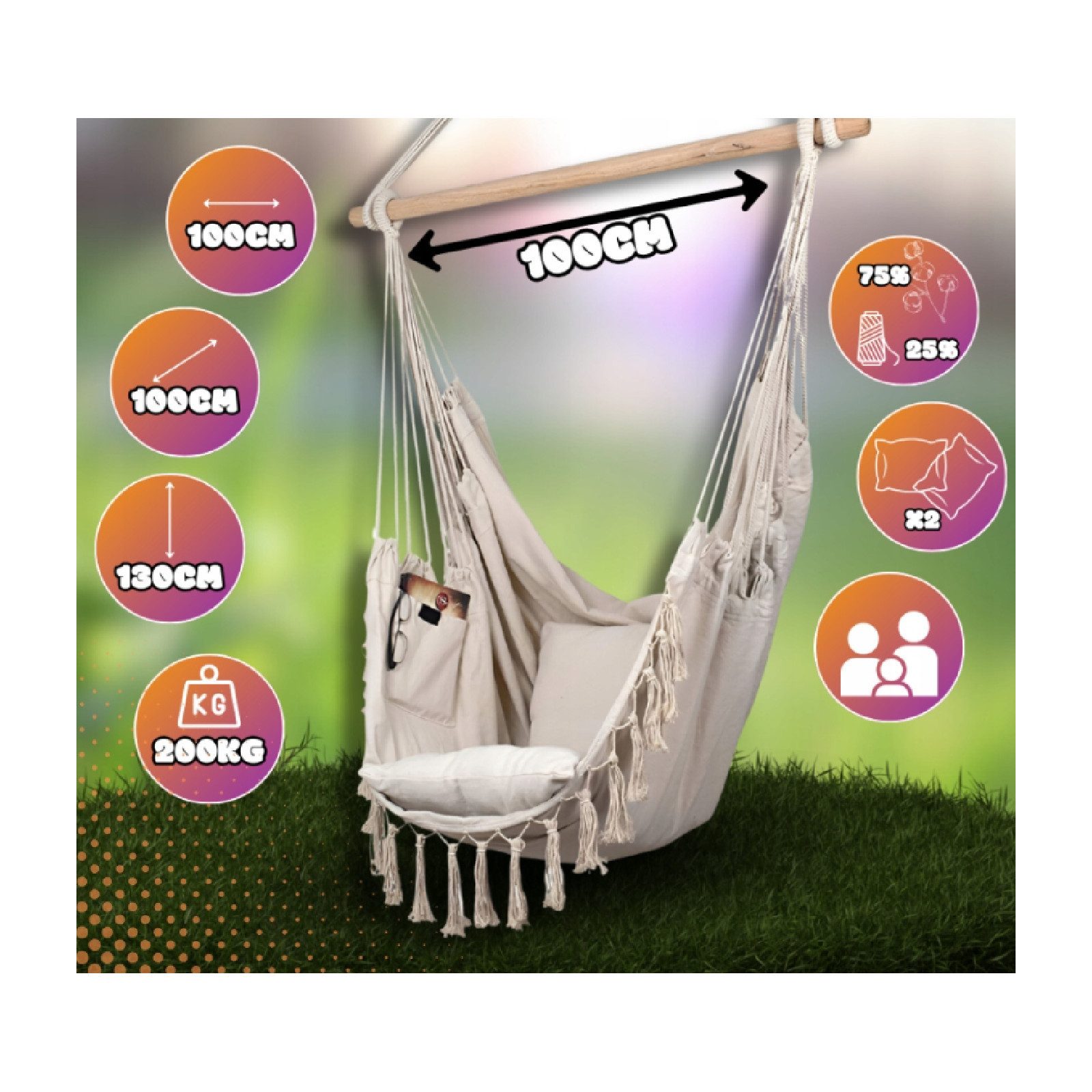 Lieferumfang | 1x Hängesessel 1x Holzstab 2x Kissen Montagezubehör |
