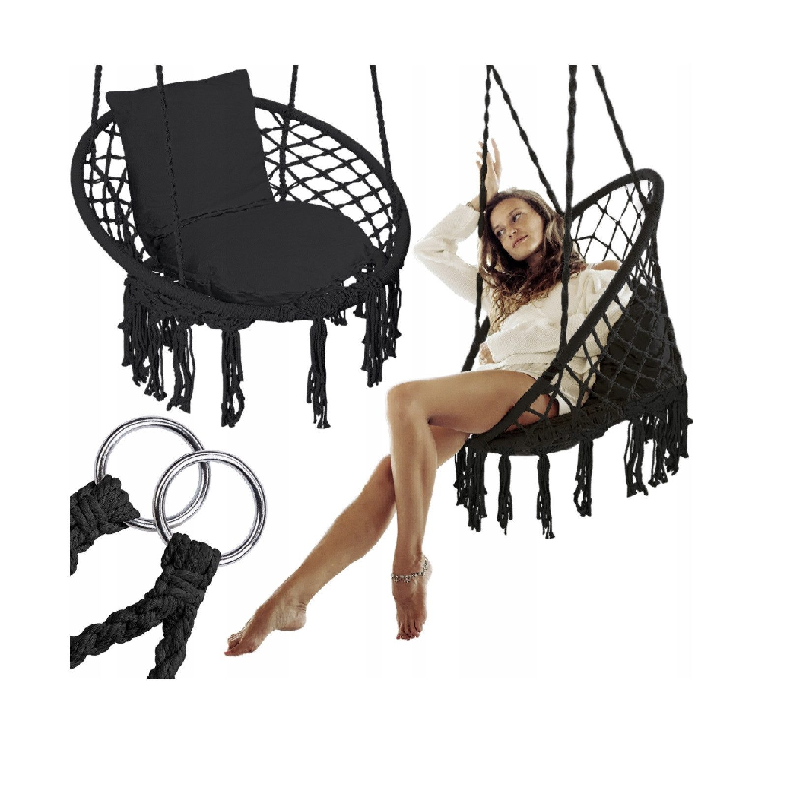 Unser Hängesessel ist die perfekte Kombination aus Komfort, Stabilität und Stil – ideal für Garten, Balkon, Terrasse oder Innenräume. Sein dekoratives Boho-Design mit handgeflochtenem Baumwollseil verleiht jeder Umgebung eine gemütliche Note. Der galvanisierte Stahlrahmen ist robust und korrosionsbeständig, während das doppelt geflochtene Sitznetz maximale Stabilität und Bequemlichkeit bietet. Dank der zwei integrierten Metallringe kann der Sessel flexibel an einem oder zwei Punkten aufgehängt werden. Die starken Baumwollseile sorgen für hohe Sicherheit beim Schaukeln oder Entspannen. Der Hängesessel lässt sich bei Nichtgebrauch schnell demontieren und platzsparend verstauen. Im Lieferumfang enthalten sind zwei weiche Kissen, die den Sitzkomfort zusätzlich erhöhen. Mit einer Tragkraft von bis zu 150 kg ist er sowohl für Erwachsene als auch Jugendliche geeignet – drinnen wie draußen.