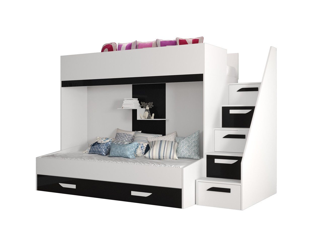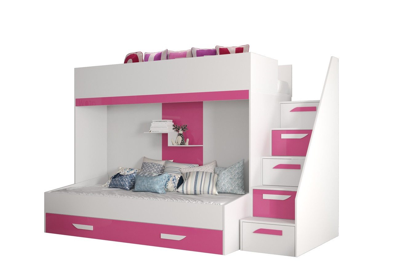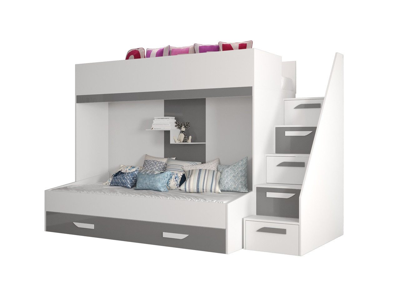 Modernes Hochbett mit 2 Schlafflächen mit 1 Bettschublade und Treppe. Ideal für kleinere Kinderzimmer.