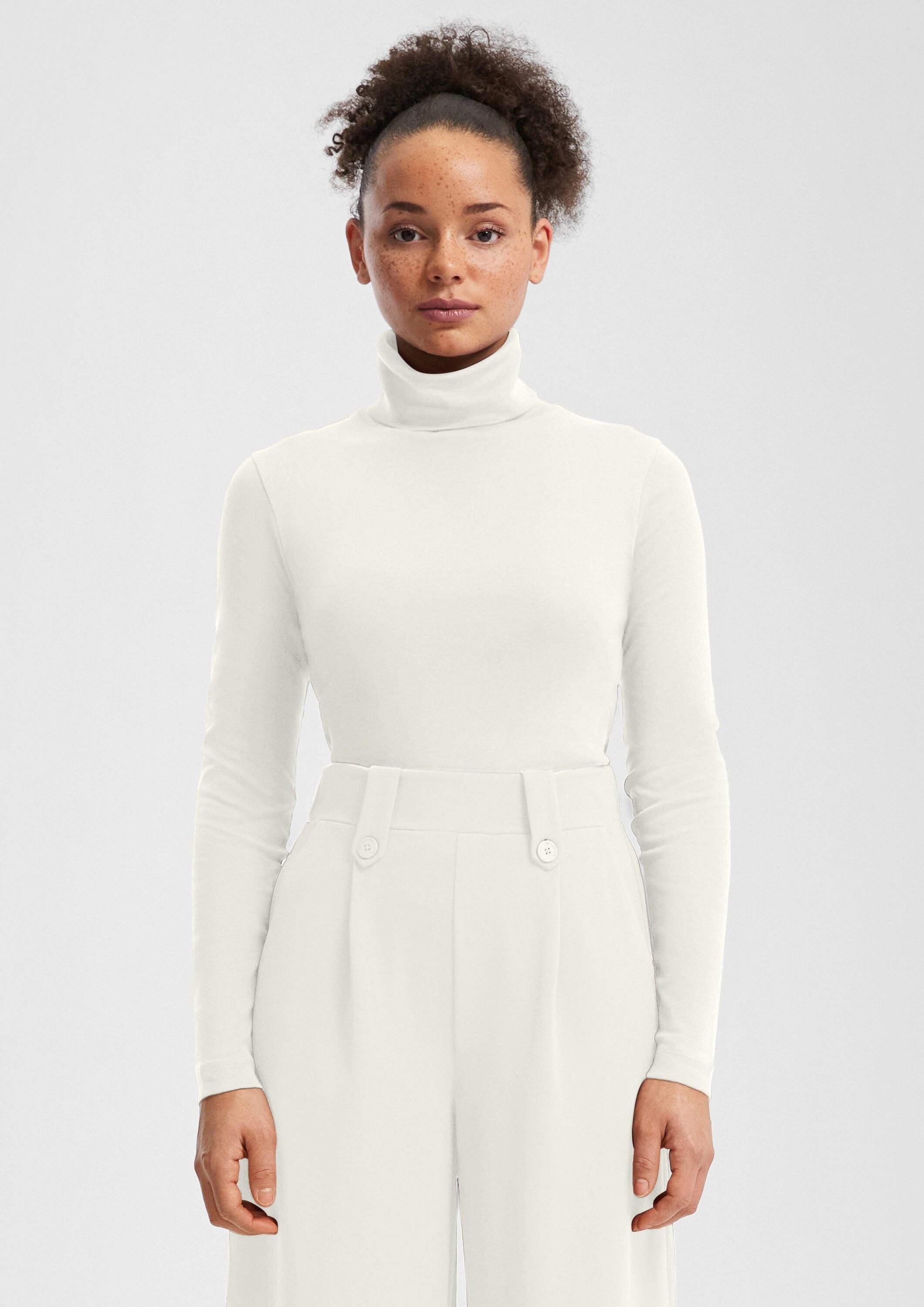 Damit du im Büro eine gute Figur machst, kombiniere zum Rollkragenshirt eine knöchellange, schmal geschnittene Stoffhose und elegante Pumps oder Boots. Als Ersatz für eine klassische Bluse kann das Oberteil auch für ein Vorstellungsgespräch angezogen werden. Kombiniere dazu eine weite Hose, Pumps und einen Gürtel.
