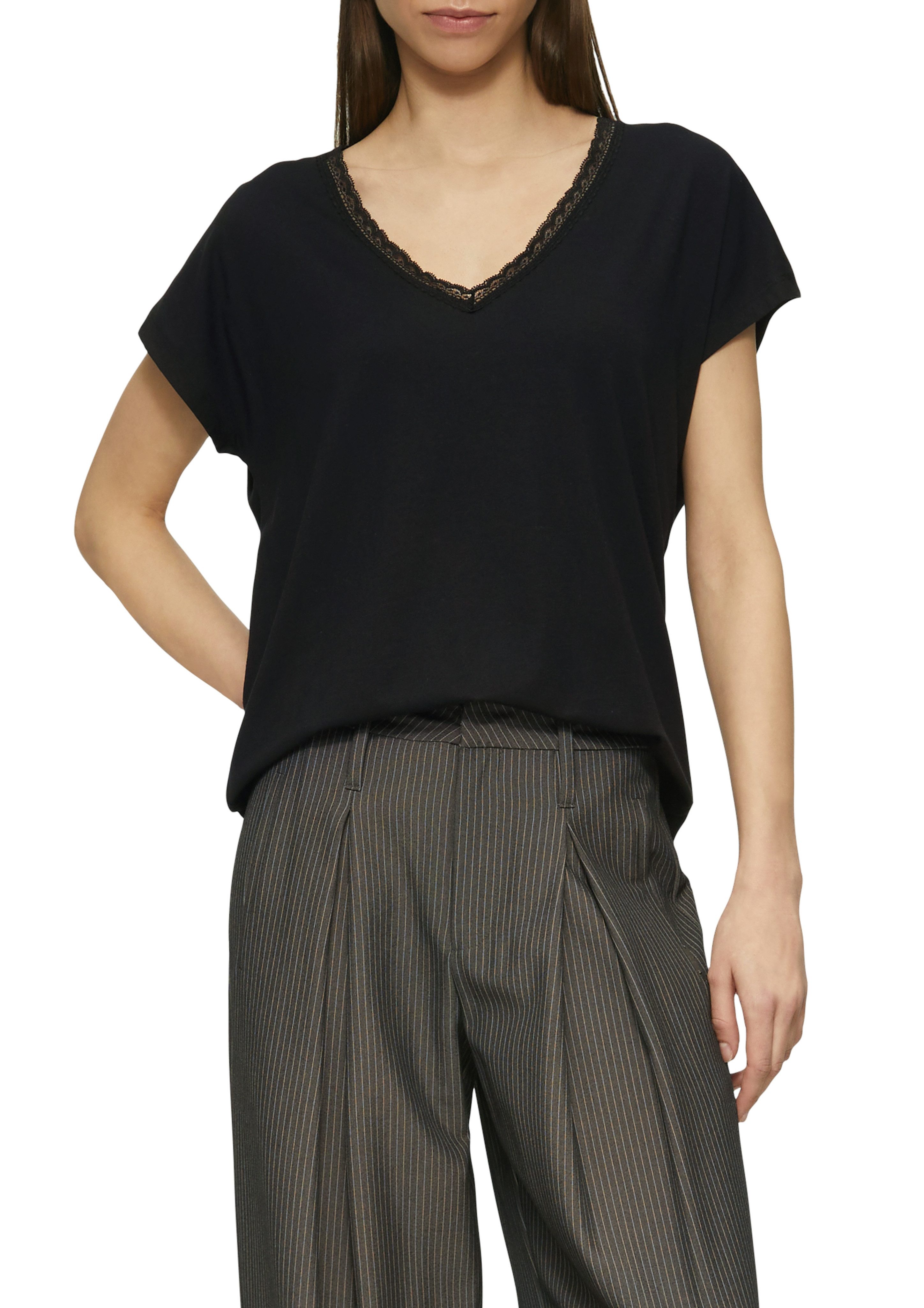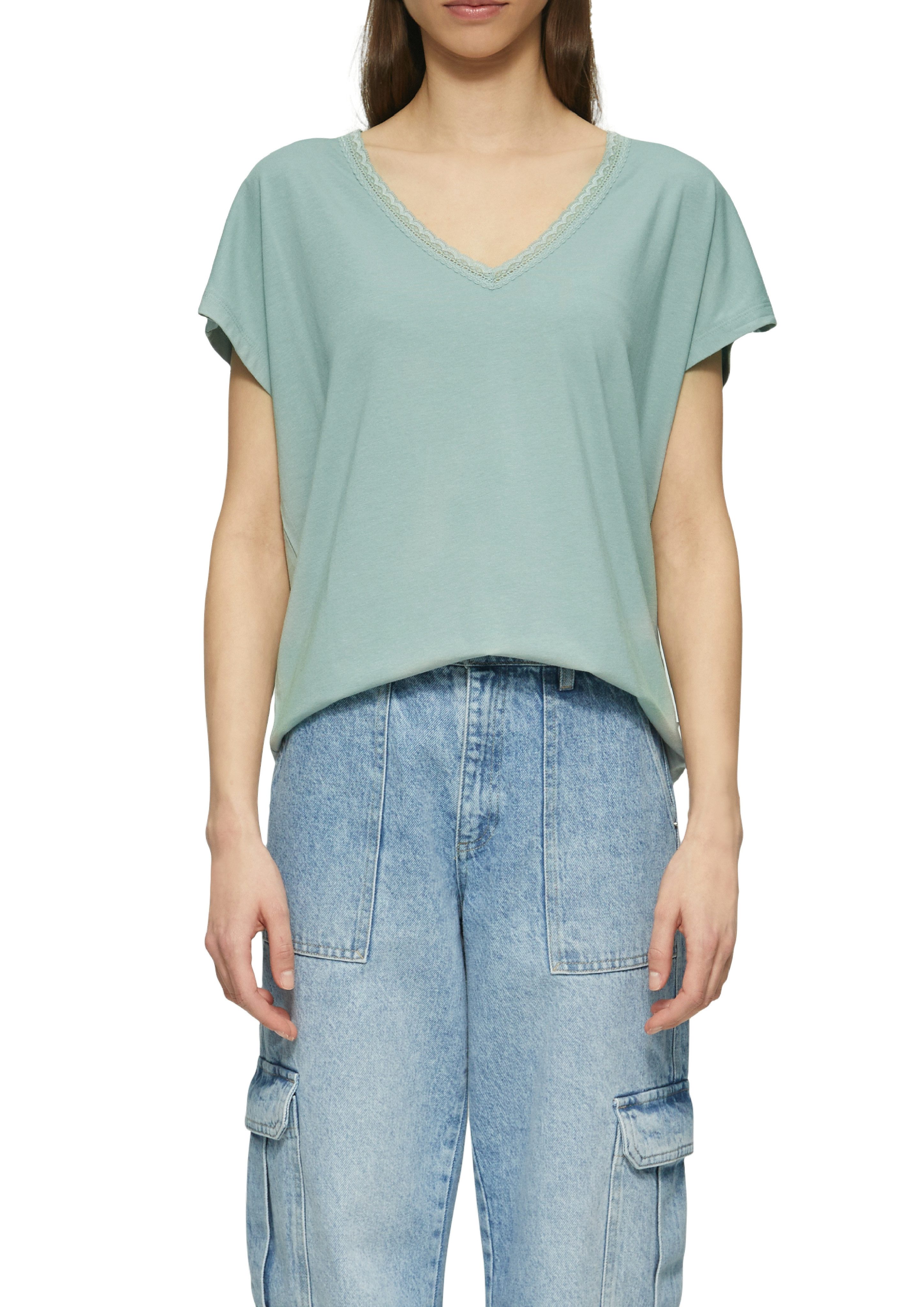 Gesucht und gefunden: Schau dir das T-Shirt von QS mal genauer an. Dieses Shirt hat einen V-Ausschnitt und ist taillenbedeckend sowie basic geschnitten, wodurch dein Oberkörper locker umspielt wird.