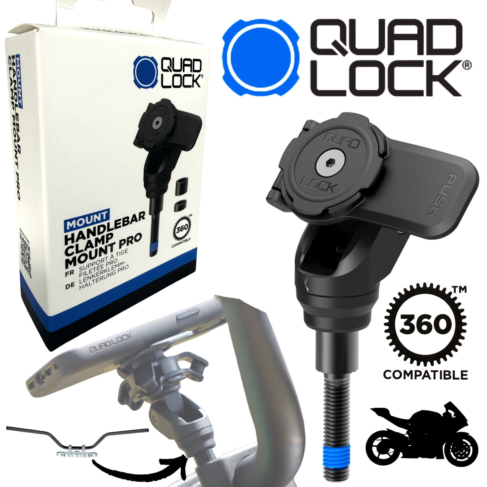 Der Quad Lock 360 Handlebar Clamp Mount PRO ist die leichteste, stärkste und sicherste Smartphone-Halterung für Motorräder. Entwickelt für Fahrer, die Wert auf maximale Stabilität und Komfort legen, bietet die Halterung ein sicheres Befestigungssystem für dein Smartphone – auch bei hohen Geschwindigkeiten und starken Vibrationen.