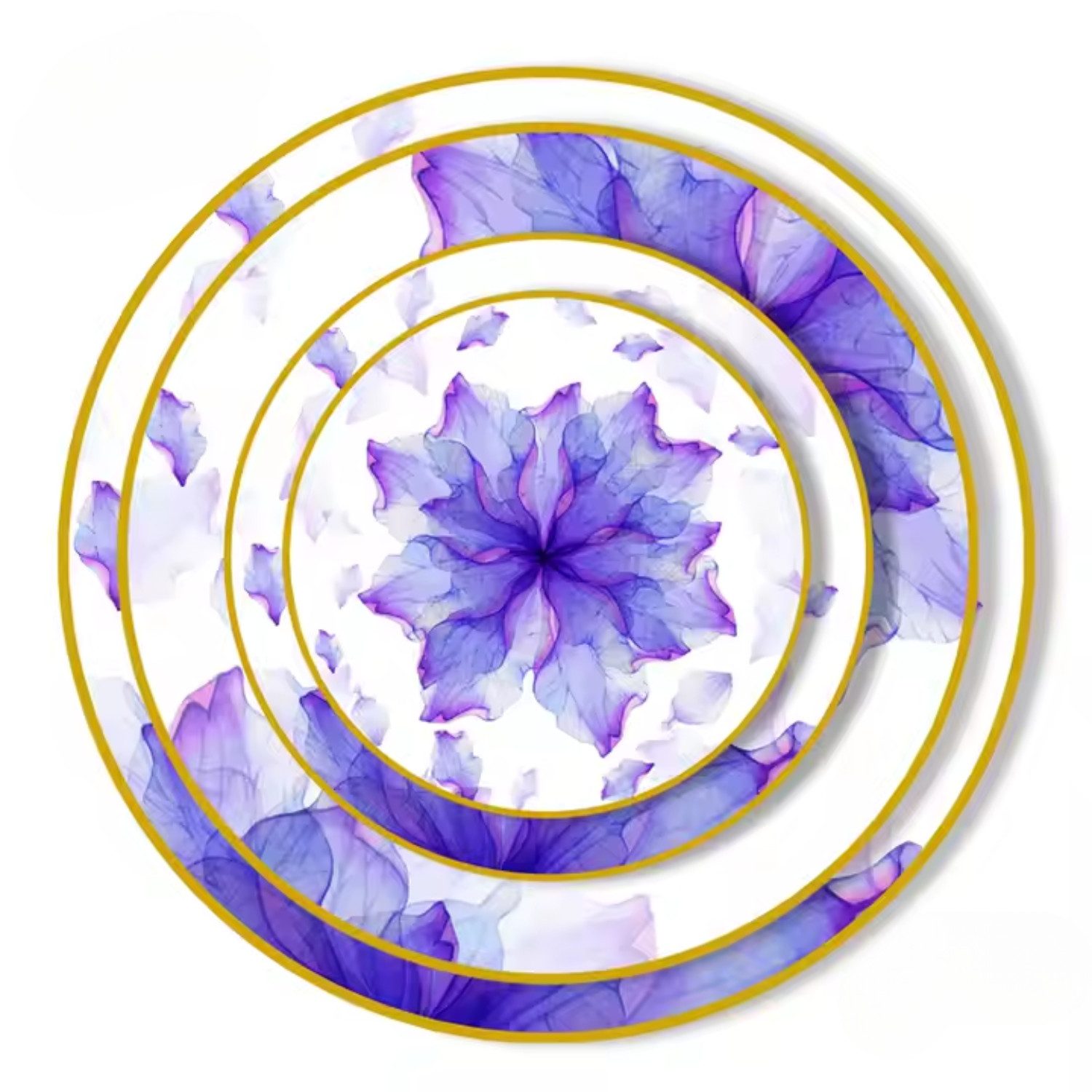 Dieses luxuriöse Geschirrset bringt florale Eleganz auf den Tisch. Mit seinem feinen lila Blumenmotiv und dem glänzenden Goldrand vereint es klassische Romantik mit moderner Raffinesse. Das Set besteht aus einem Platzteller, Essteller, Dessertteller und Brotteller – gefertigt aus hochwertigem Fine Bone China für eine exquisite Haptik und Optik. Ideal für besondere Anlässe, stilvolle Dinnereinladungen oder als Geschenk für Liebhaber eleganter Tischkultur.