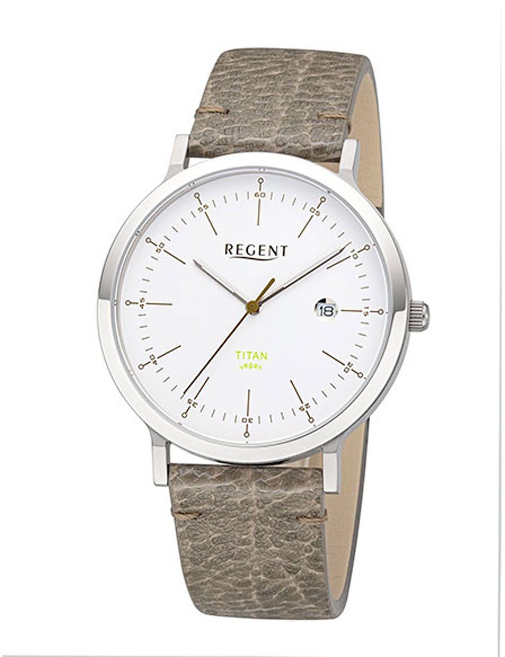 Regent BA-704 Herrenuhr mit veganem Armband aus ApfelschaleDas Modell ist mit einem Quarz Uhrwerk ausgestattet. Die Zifferblattfarbe ist Weiß. Dieses Modell hat Ziffern in Strichindex. Die Zeitanzeige ist Analog.
