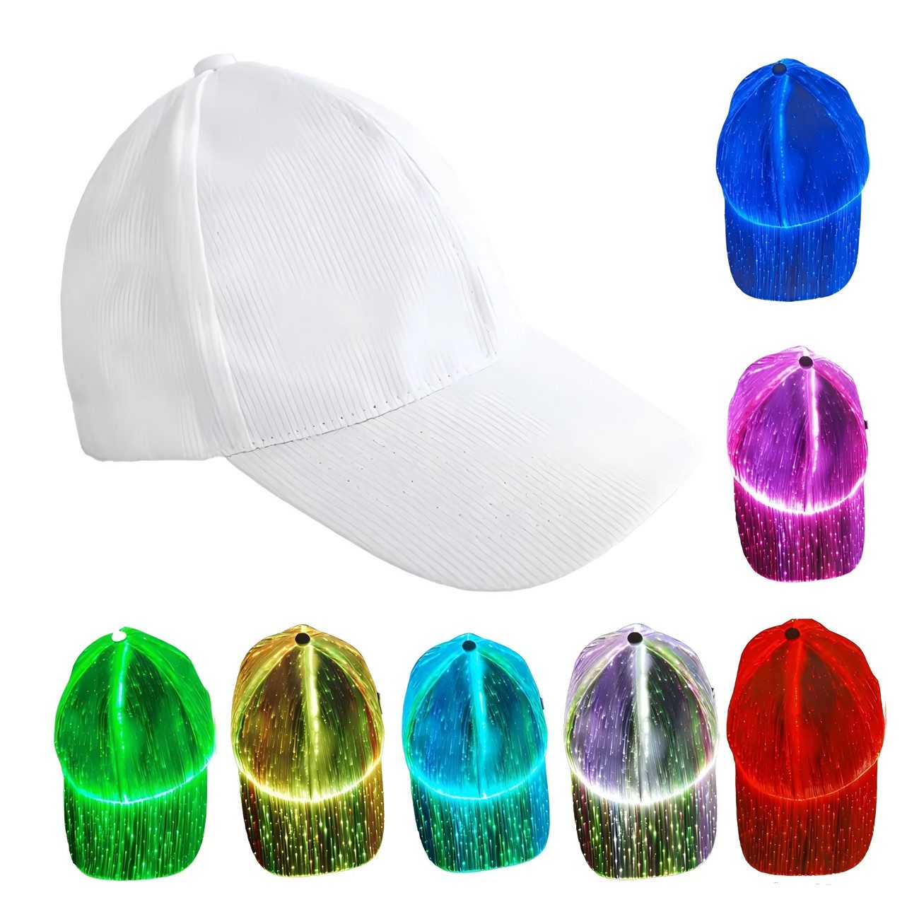 Die LED-Glasfaserkappe leuchtet in 7 Farben (Rot, Blau, Grün, Gold, Hellblau, Lila, Weiß) und 11 Leuchtmodi, darunter Monochrom (7 Arten), Blinken, allmähliches, sanftes und mehrfarbiges Licht. Wählen Sie den Modus per Schalter aus, um auf der Party aufzufallen und die Aufmerksamkeit der Leute auf sich zu ziehen.