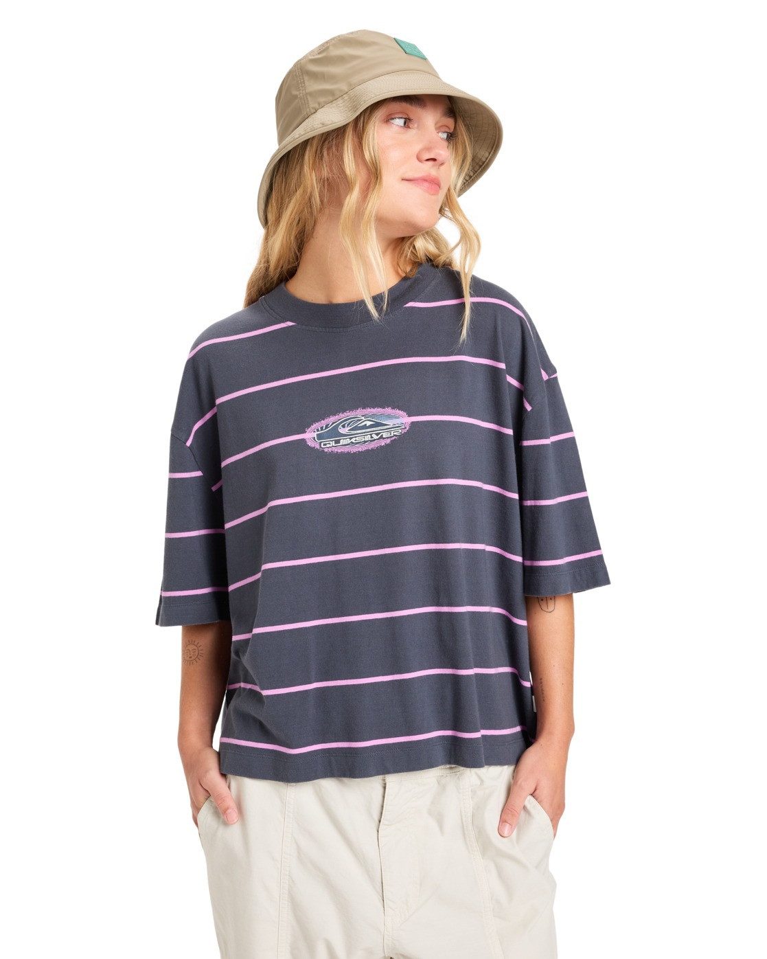 quiksilver Stripart - Short Sleeve T-Shirt for Women Stripart - T-Shirt für Frauen T-Shirt für Frauen. Die Eigenschaften dieses Produkts sind: Stoff: Baumwolle, (180 g/m2), Passform: Boyfriend kürzerer Fit, Hals: Rundhalsausschnitt, Waschung: starker Stone Wash für einen Vintage-Look, Garngefärbte Streifen, Platzierte Motive auf Vorder- und Rückseite, Rippstrick-Kragen und Gewebtes Label aus recyceltem Material.