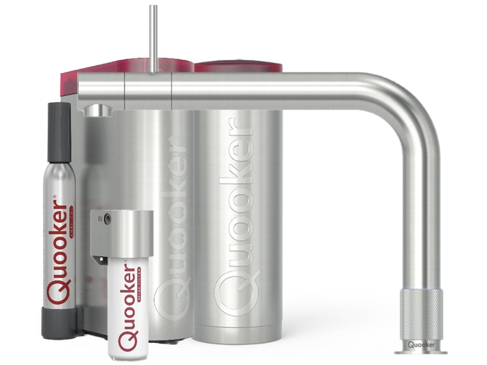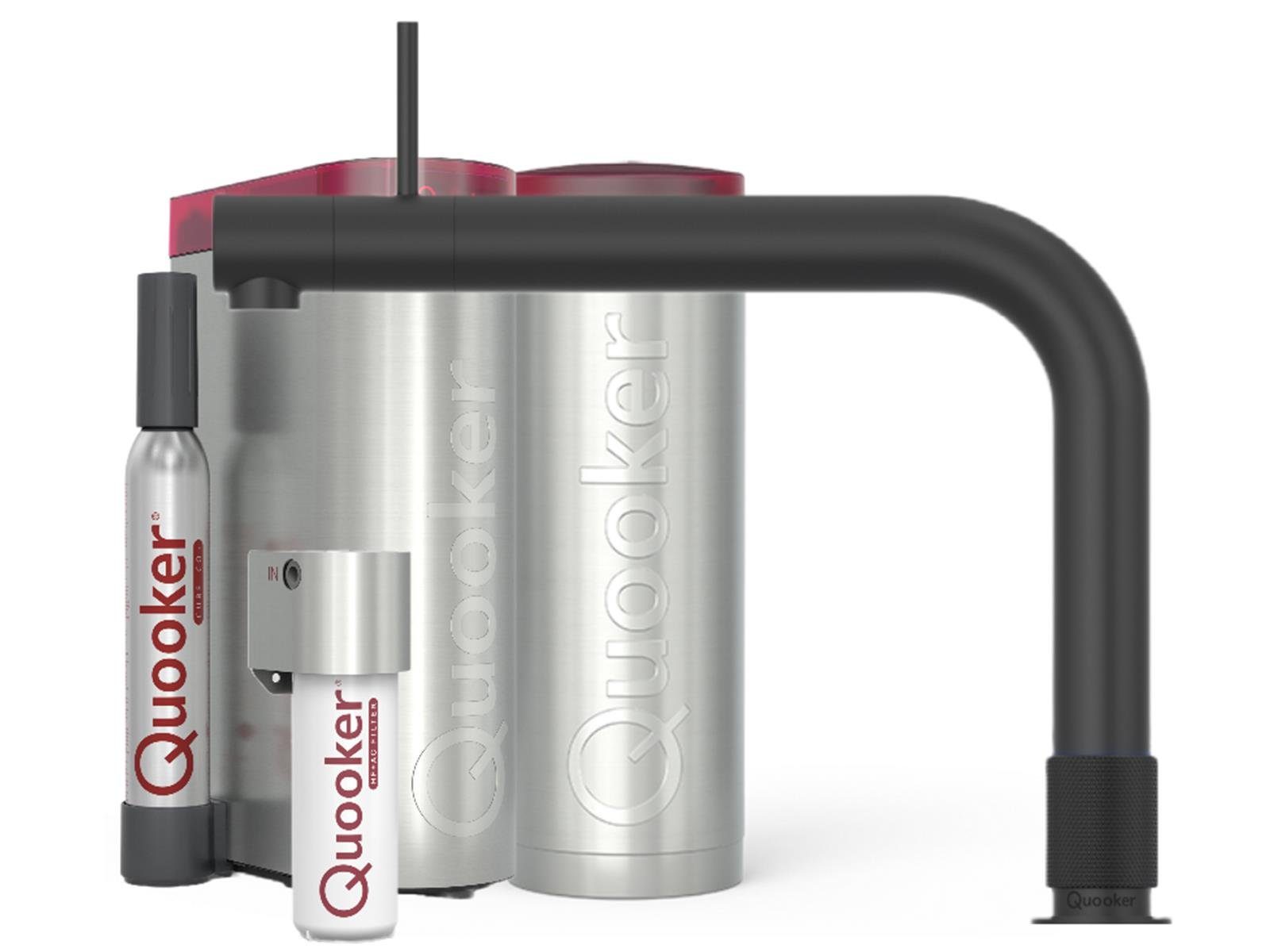Quooker Front Ein markanter Blickfang in der Küche. Lupenrein, industriell und ergonomisch. Das Modell Quooker Front liefert warmes, kaltes, 100 °C kochendes sowie gekühltes sprudelndes und stilles Wasser und hat an der Vorderseite des Auslaufs eine neue Warm- und Kaltwasserbedienung. Der Front ist in zwei Ausführungen erhältlich, Edelstahl sowie Schwarz und kann mit jedem Quooker-Reservoir kombiniert werden |