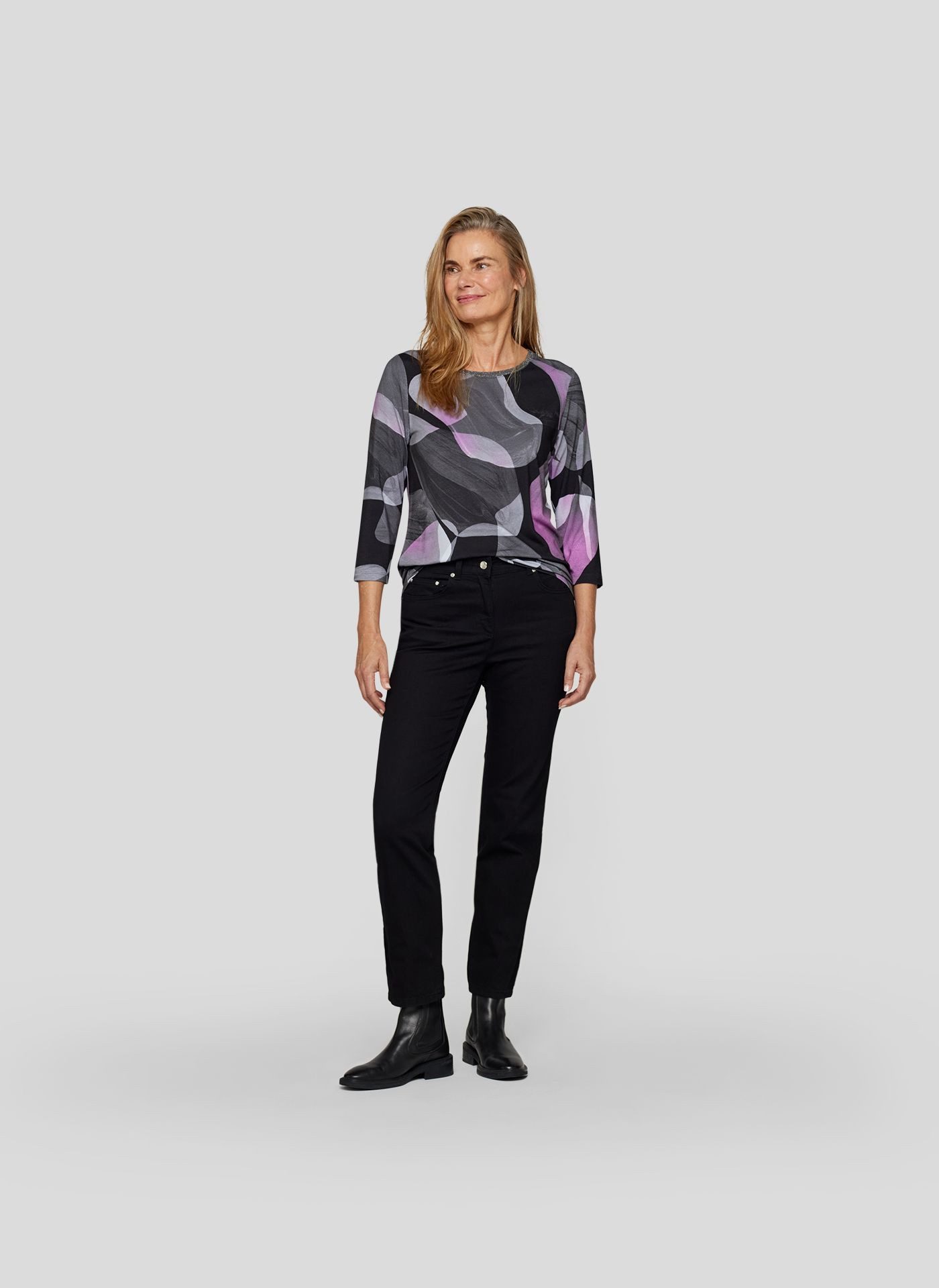 Elegantes Shirt von RABE mit künstlerischem Print in Grau, Schwarz und Pink _ ideal für einen stilvollen, femininen Look. Künstlerischer Print _ Moderne Kombination für einen einzigartigen Stil. Glitzernder Rundhalsausschnitt _ Dezentes Funkeln, das dem Shirt einen Hauch von Eleganz verleiht. 3/4-Ärmel _ Perfekt für jede Jahreszeit und vielseitig kombinierbar. Bequeme Passform _ Femininer Schnitt, der die Silhouette sanft betont.
