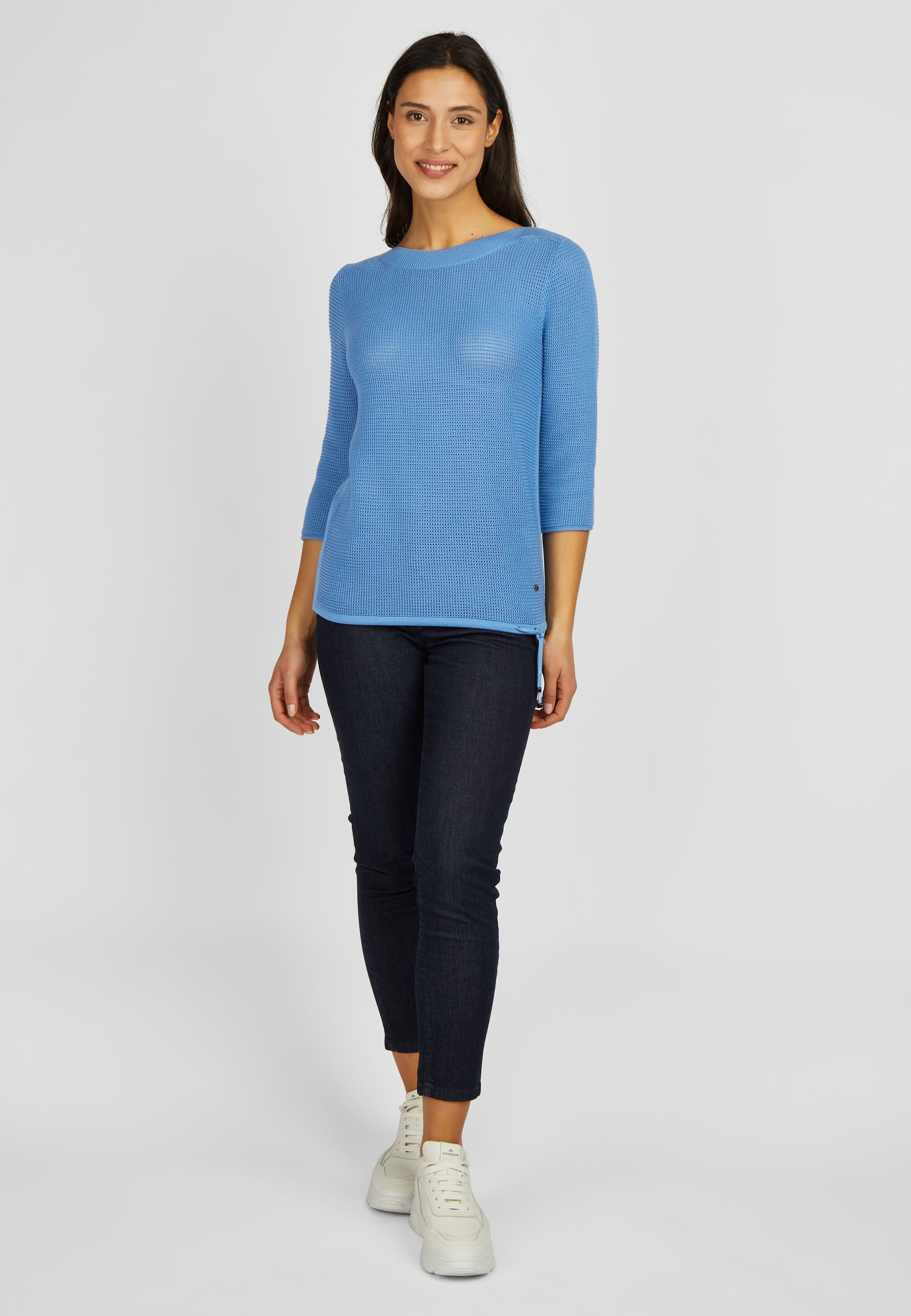 Der Saum lässt sich mittels Zugbändern raffen und umspielt so die Figur. Die Ärmel mit 3/4 Длина sind ideal, um Schmuck am Handgelenk zu präsentieren. Der seitliche Metall-Herzanhänger setzt verspielte Akzente. Mit einer gemusterten Hose und Sneakern wird der Look komplett.