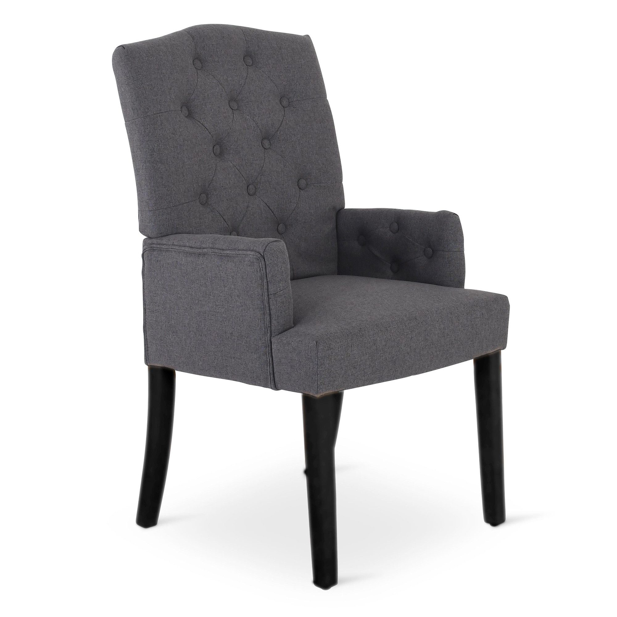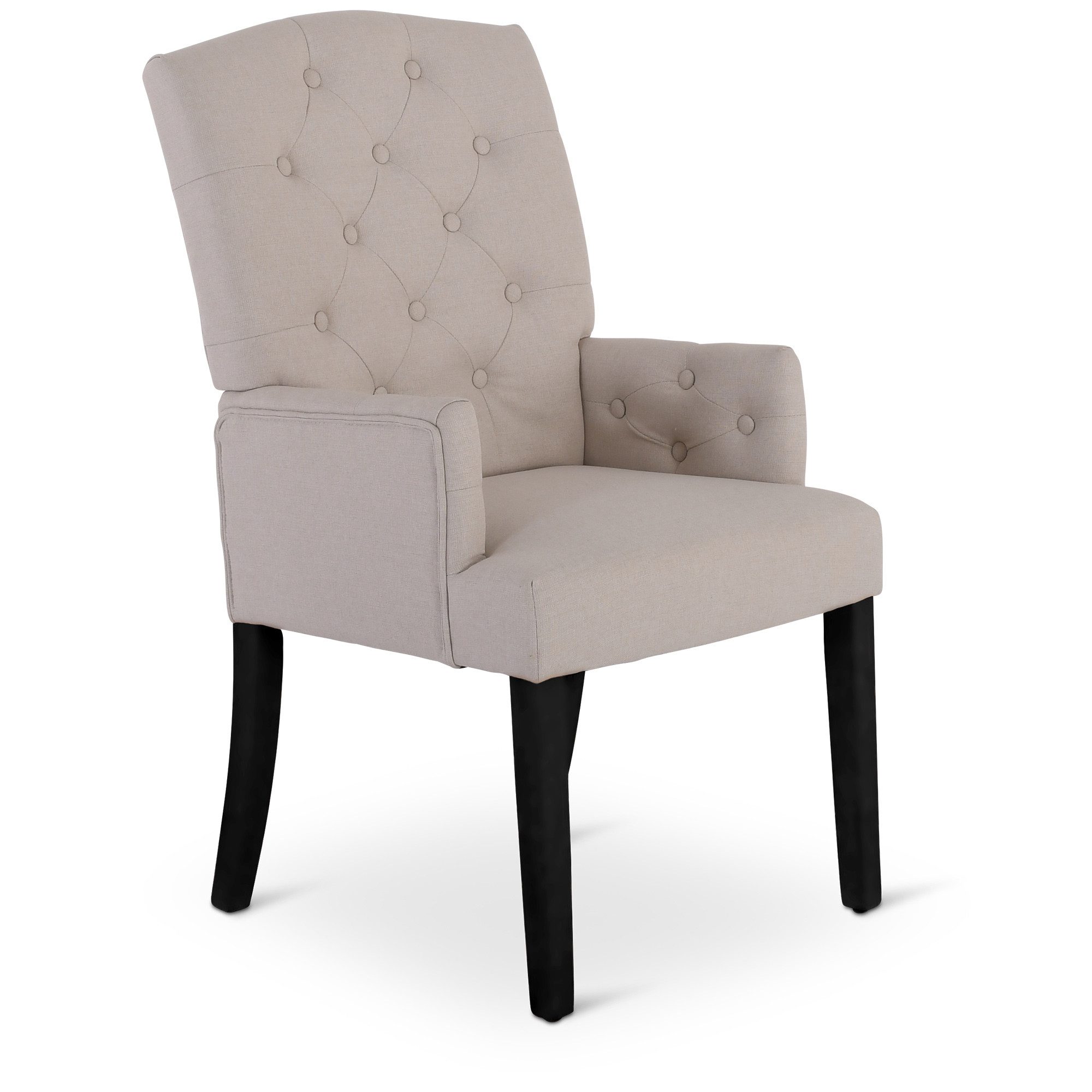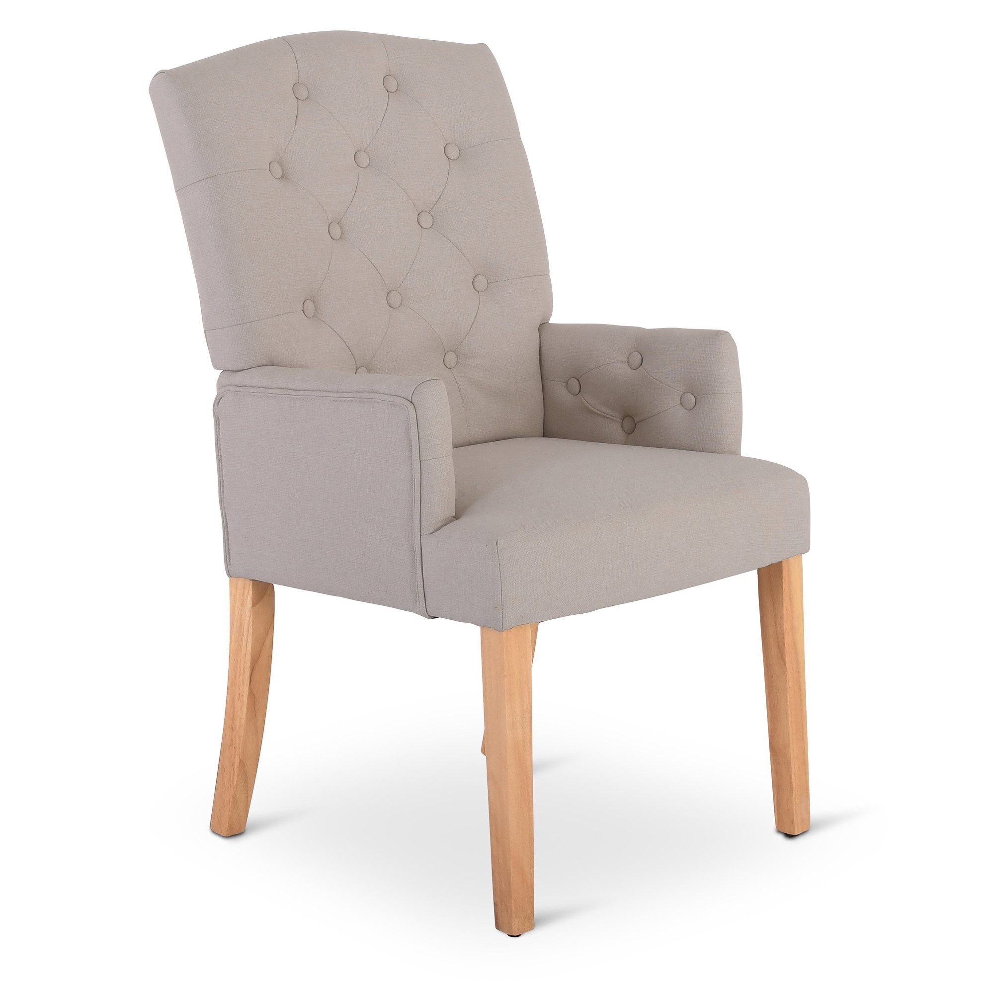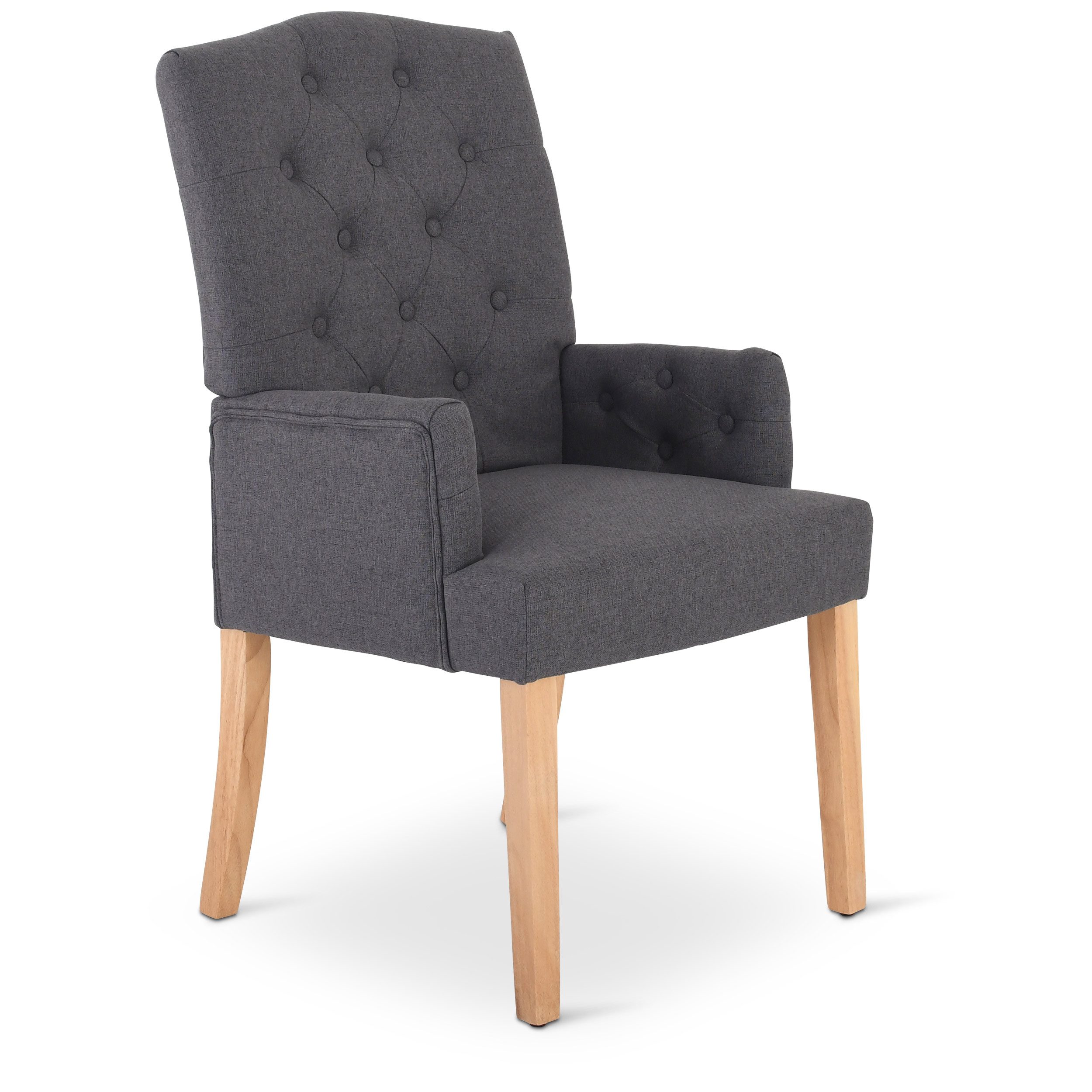 Wissenswertes | Landhausstil Esszimmerstuhl, elegant & gemütlich Komfortabel: Hohe Rückenlehne & bequeme Polsterung Chesterfield-Design: Rückenlehnen und Armlehnen mit Zierknöpfen Hingucker am Esstisch, perfekt für Wohnbereich, Küche und Esszimmer Stabiler Stand: Dunkle Massivholzbeine, vorne um 10 mm höhenverstellbar |