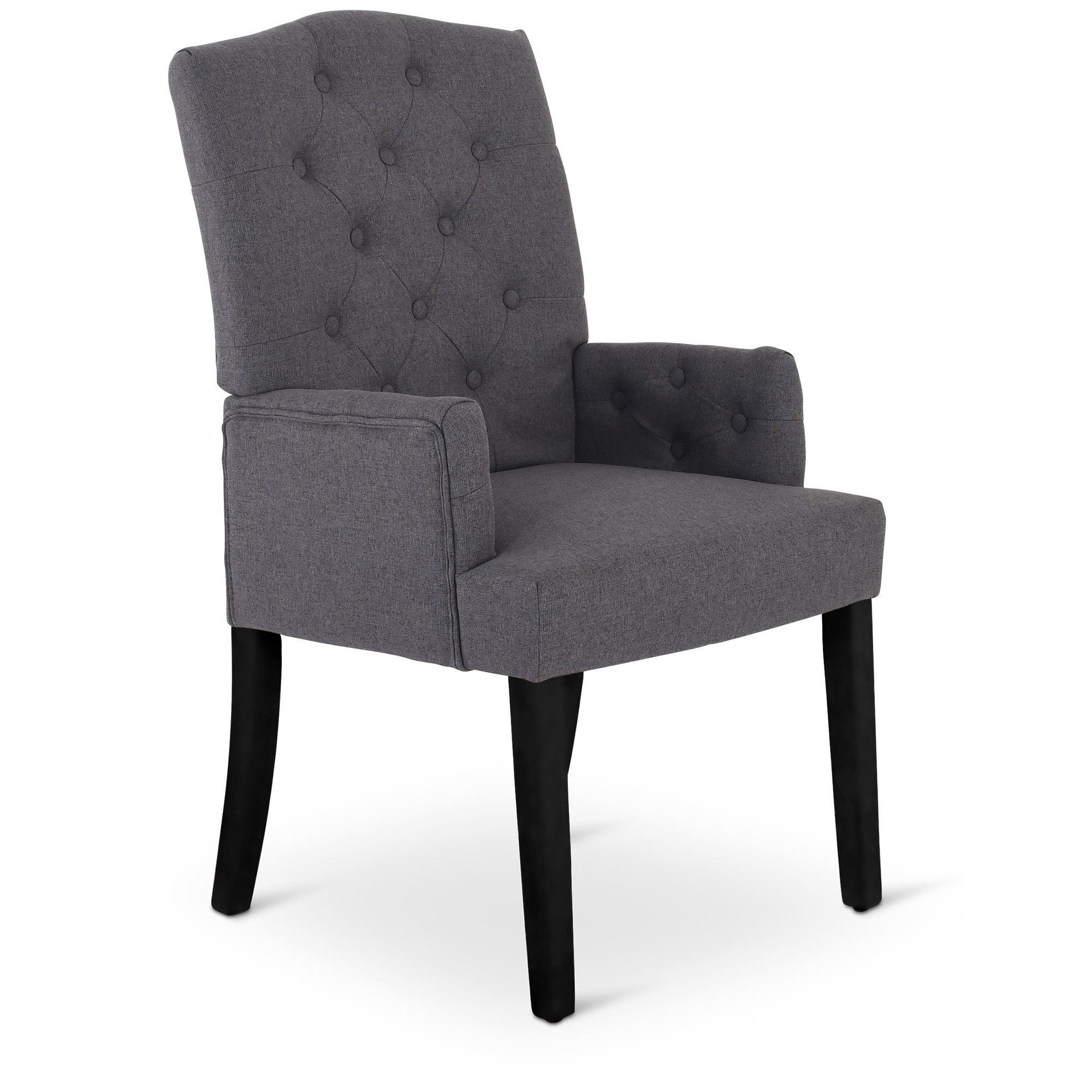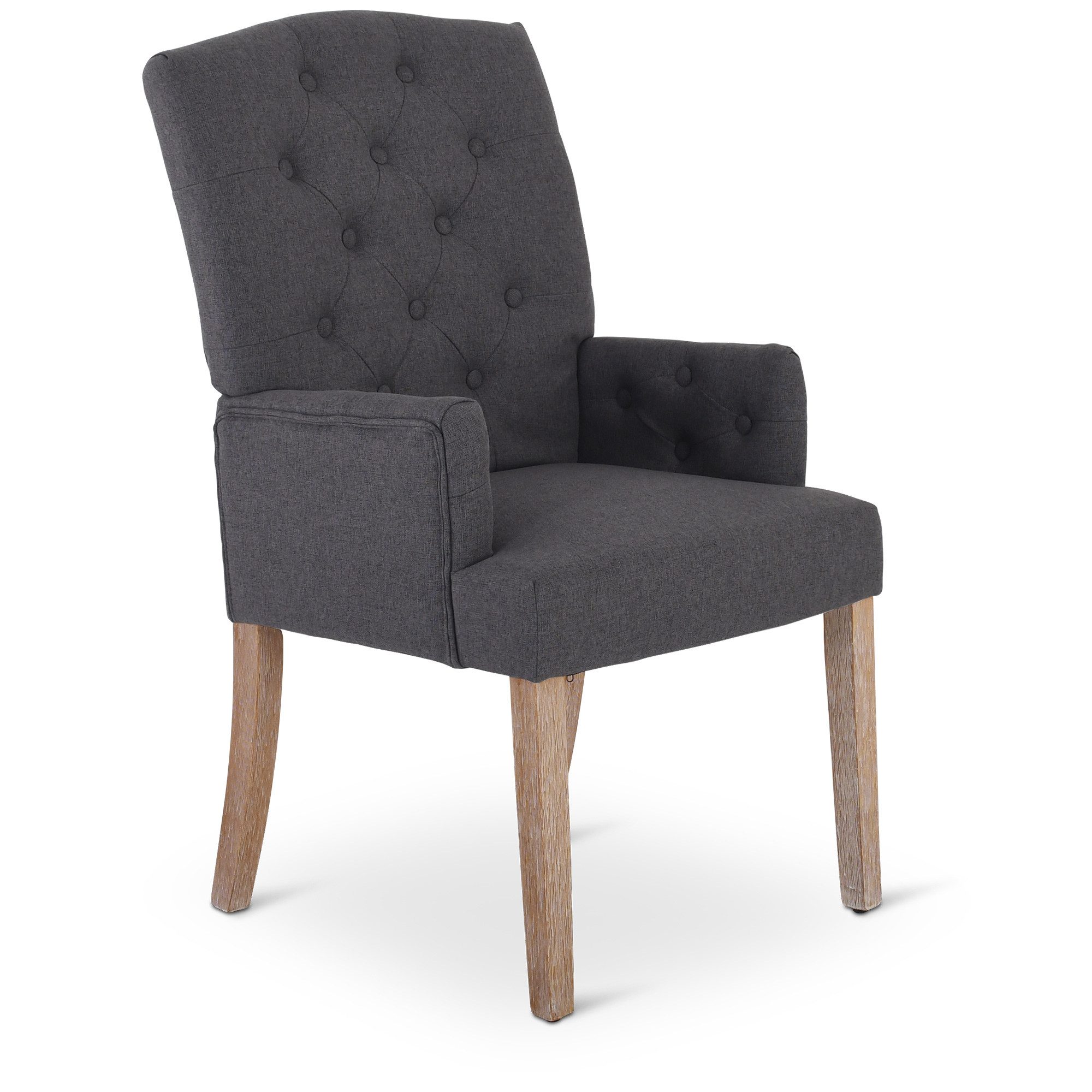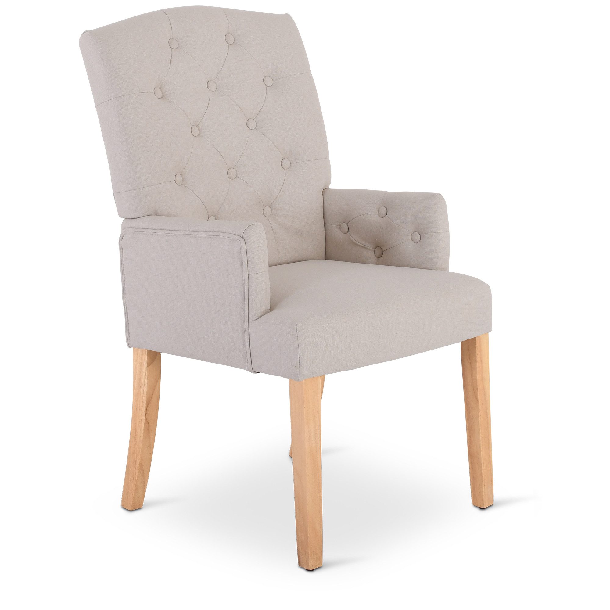 Wissenswertes | Landhausstil Esszimmerstuhl, elegant & gemütlich Komfortabel: Hohe Rückenlehne & bequeme Polsterung Chesterfield-Design: Rückenlehnen und Armlehnen mit Zierknöpfen Hingucker am Esstisch, perfekt für Wohnbereich, Küche und Esszimmer Stabiler Stand: Dunkle Massivholzbeine, vorne um 10 mm höhenverstellbar |