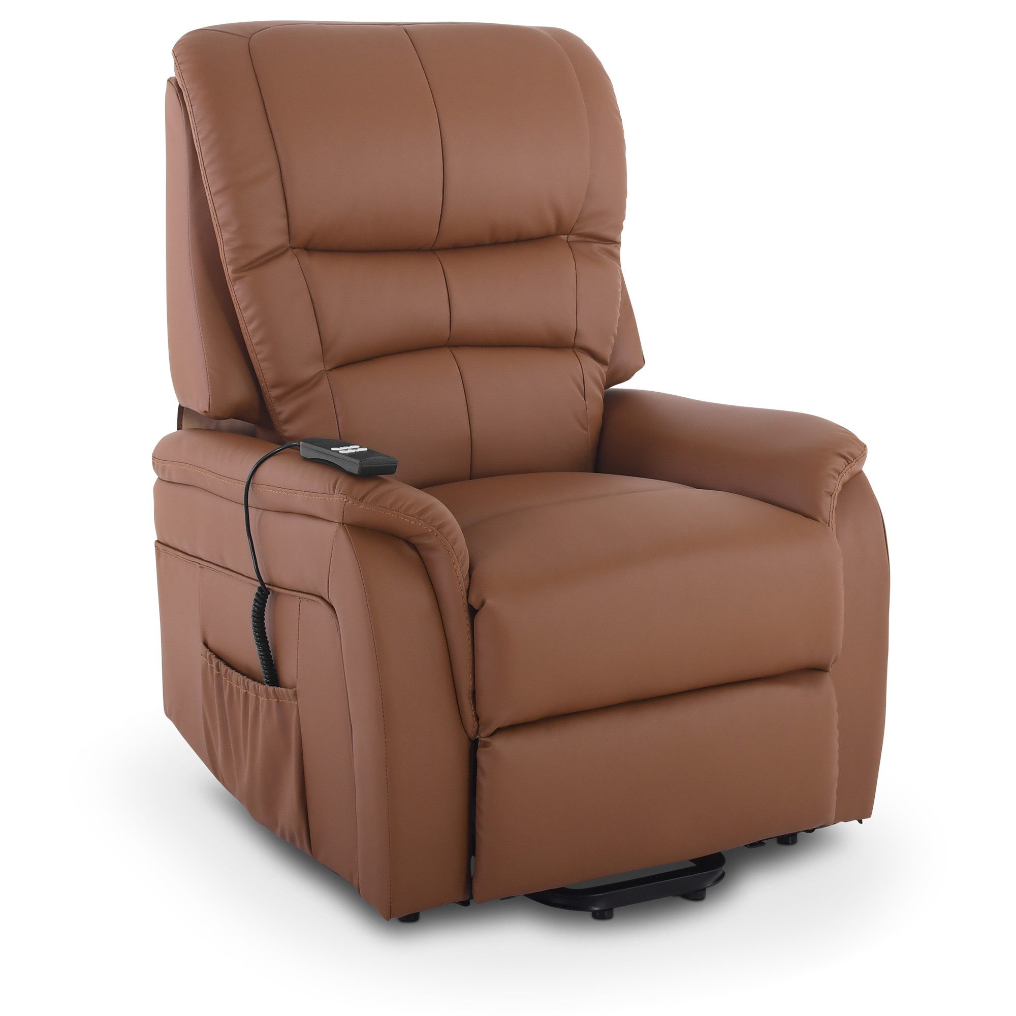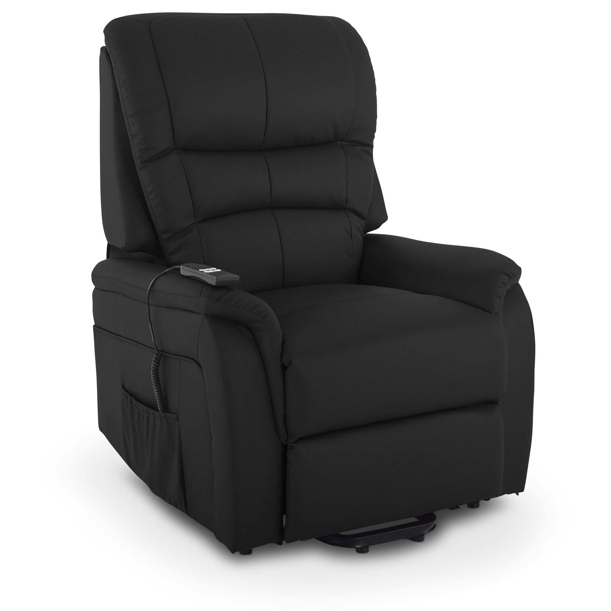 Dank zwei leiser Motoren lassen sich Rückenlehne und Fußstütze separat per Fernbedienung verstellen – inklusive 180°-Liegeposition und Herz-Waage-Funktion. Die pflegeleichte Soft-Touch-Kunstleder-Oberfläche kombiniert edle Lederoptik mit angenehmer Haptik und robuster Alltagstauglichkeit. Ein eleganter Fernsehsessel mit praktischer Seitentasche, Rollen und stabilem Stahlgestell.
