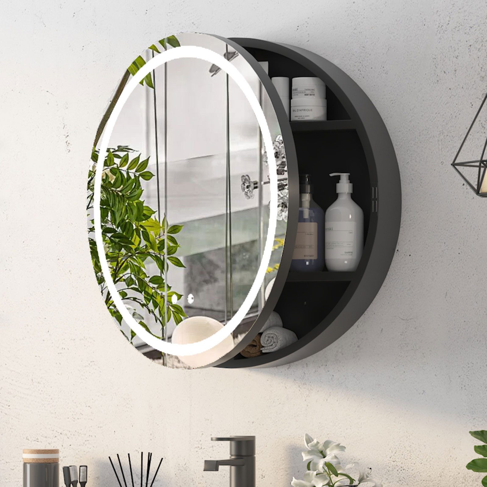 kreisförmiger, metallgerahmter schwarzer Medizinschrank für das Badezimmer mit Entfeuchtungskraft bietet nicht nur moderne Eleganz mit seinem hochwertigen Design, das in verschiedene Einrichtungsstile passt, sondern auch Langlebigkeit und Rostfreiheit. Er ist 100 % montiert, muss nur an der Wand befestigt werden, was die Montagezeit erheblich verkürzt. Der Türrahmen aus Eisen verbindet ästhetischen Metallglanz mit Wasserdichtigkeit. Mit 3 Farben zur Auswahl, 3 Farbtemperaturen (3000K/4500K/6000K), stufenlosen Dimmoptionen, intelligenter Speicherfunktion und einer schnellen Entfogging-Funktion, die automatisch ausgeschaltet wird, wenn das Licht aus ist, bietet er ein personalisiertes Lichterlebnis und verbessert das Pflegeerlebnis im Badezimmer.