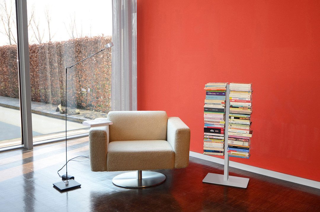 Das unsichtbare Bücherregal Booksbaum von Radius Design ist ein Metallregal, das durch die Bücher verdeckt wird und somit wirkt es als ob die Bücher im Raum schweben würden. Das Booksbaum Bücherregal verleiht Ihren Lieblings-Büchern neuen Glanz und lässt Sie zu einem Deko-Objekt werden. Nutzen Sie auch den kleinen Abstand zwischen der Fußplatte und dem ersten Regalboden um Ihre Bücher scheinbar von unsichtbarer Hand gehalten im Raum schweben zu lassen. Der kleine Booksbaum 1 mit Standfuß bietet Ihnen mit 8 Regalböden ausreichend Platz für Ihre Lieblingsbücher. Dank der separaten bis zu 6,5 kg belastbaren Böden können Bücher leicht entnommen werden, ohne das Sie gleich den ganzen Bücherturm demontieren müssen. Präsentieren Sie Ihre Bücher auf moderne Weise in Ihren Wohnräumen, im Büro oder im Wartezimmer. Mit dem Booksbaum Bücherturm können Sie auch kleine Zwischenräume optimal ausnutzen und in Szene setzen. Die waagerechte Stapelung der Bücher wird Ihnen auch das lesen der Buchtitel auf angenehme Art erleichtern. Der Booksbaum von Radius Design ist alternativ auch in einer kleineren Version und/oder als Wandversion erhältlich. Reduziertes Design trifft auf Funktionalität und beste Qualität.