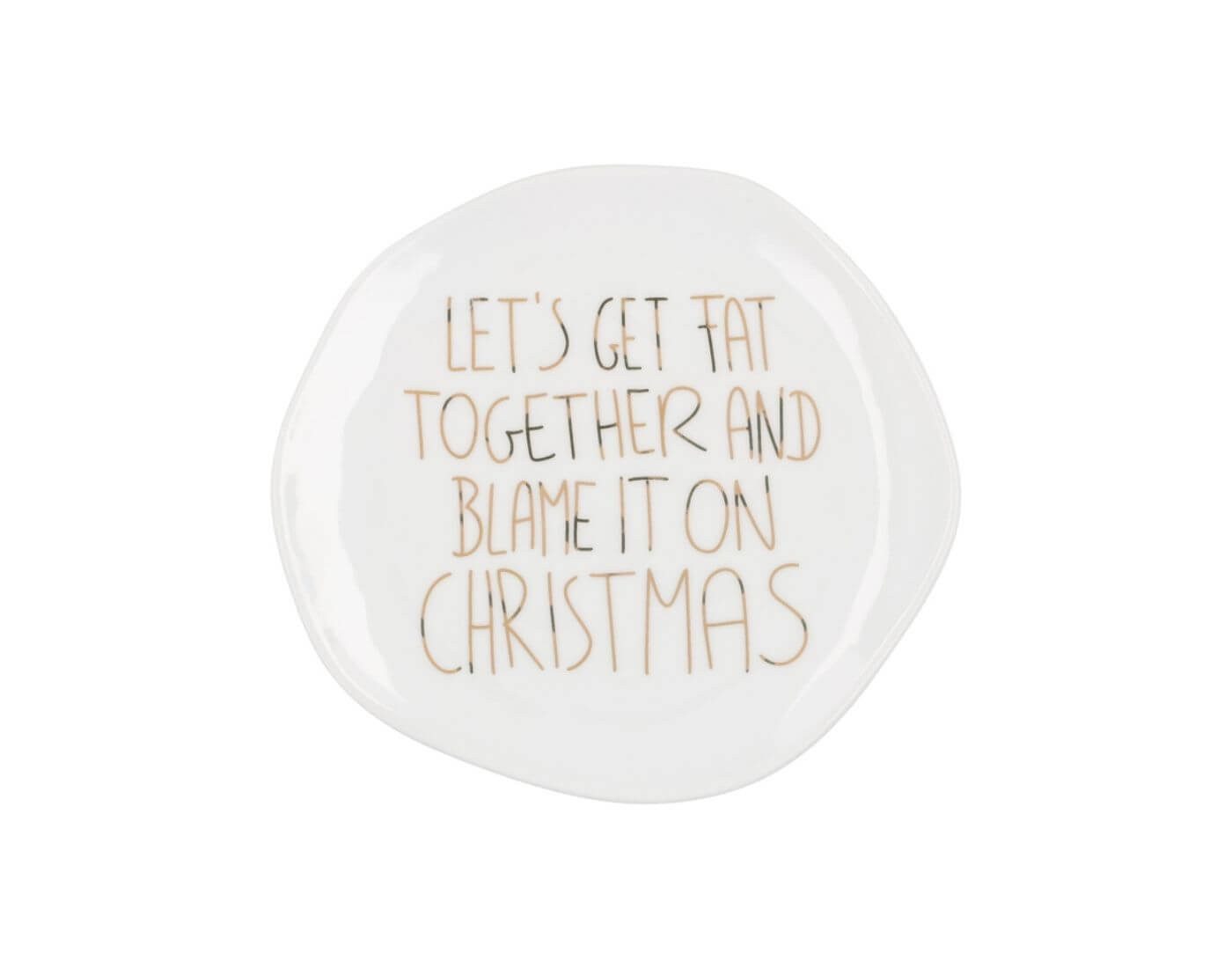 Die guten Vorsätze können warten: An Weihnachten muss man sich auch mal etwas gönnen. Kleiner Weihnachtsteller mit dem Schriftzug "Let's get fat together and blame it on christmas".